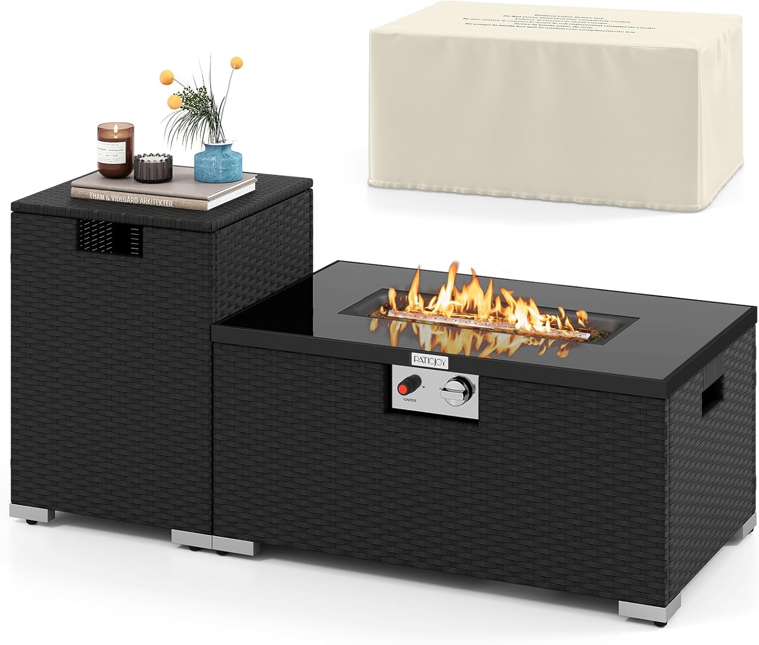 Tangkula 2-Piece Outdoor Rattan Fire Table Set 32 Inch Rectangle Gas Firepit with Tank Cover