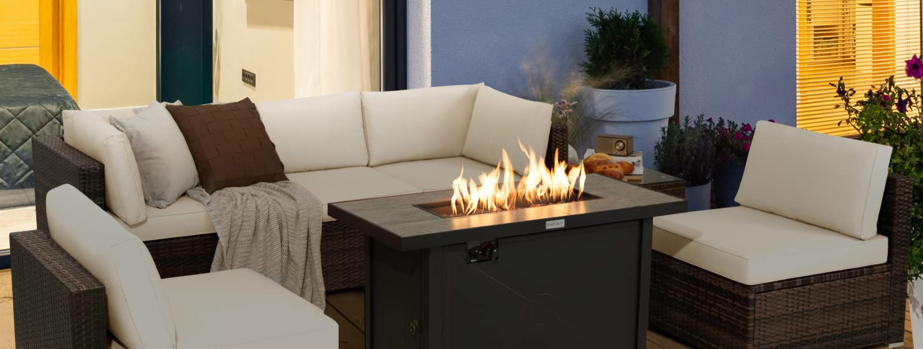 Tangkula 7 Piece Patio Furniture Set with Fire Pit Table, Includes 42 Inches 60,000 BTU Propane Rectangle Fire Pit Table