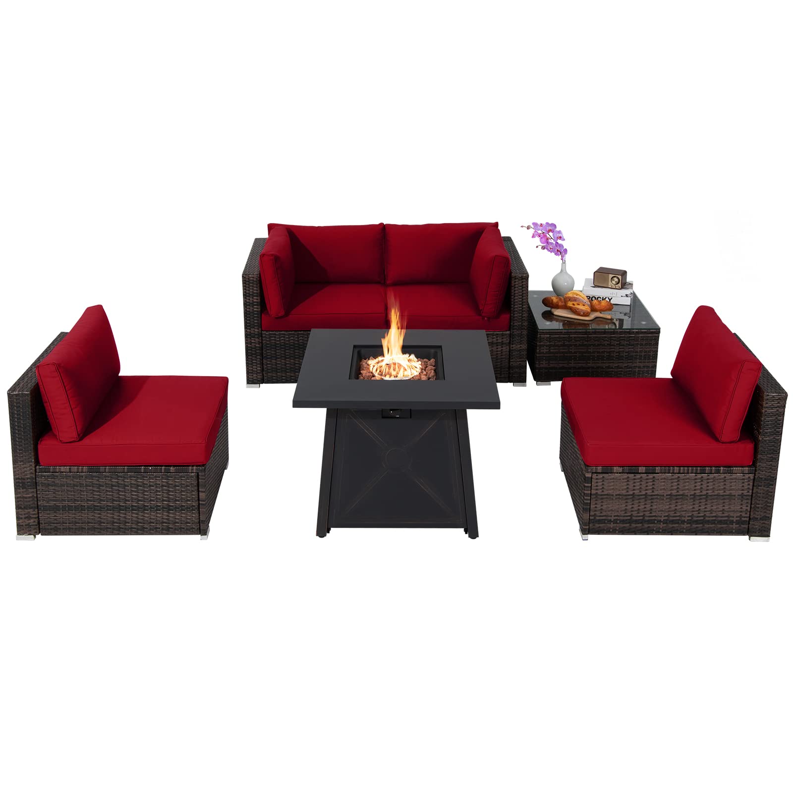 Tangkula 6-Piece Outdoor PE Wicker Conversation Set Cushions and Tempered Glass Coffee TableGas Fire Pit Table with 50,000 BTU