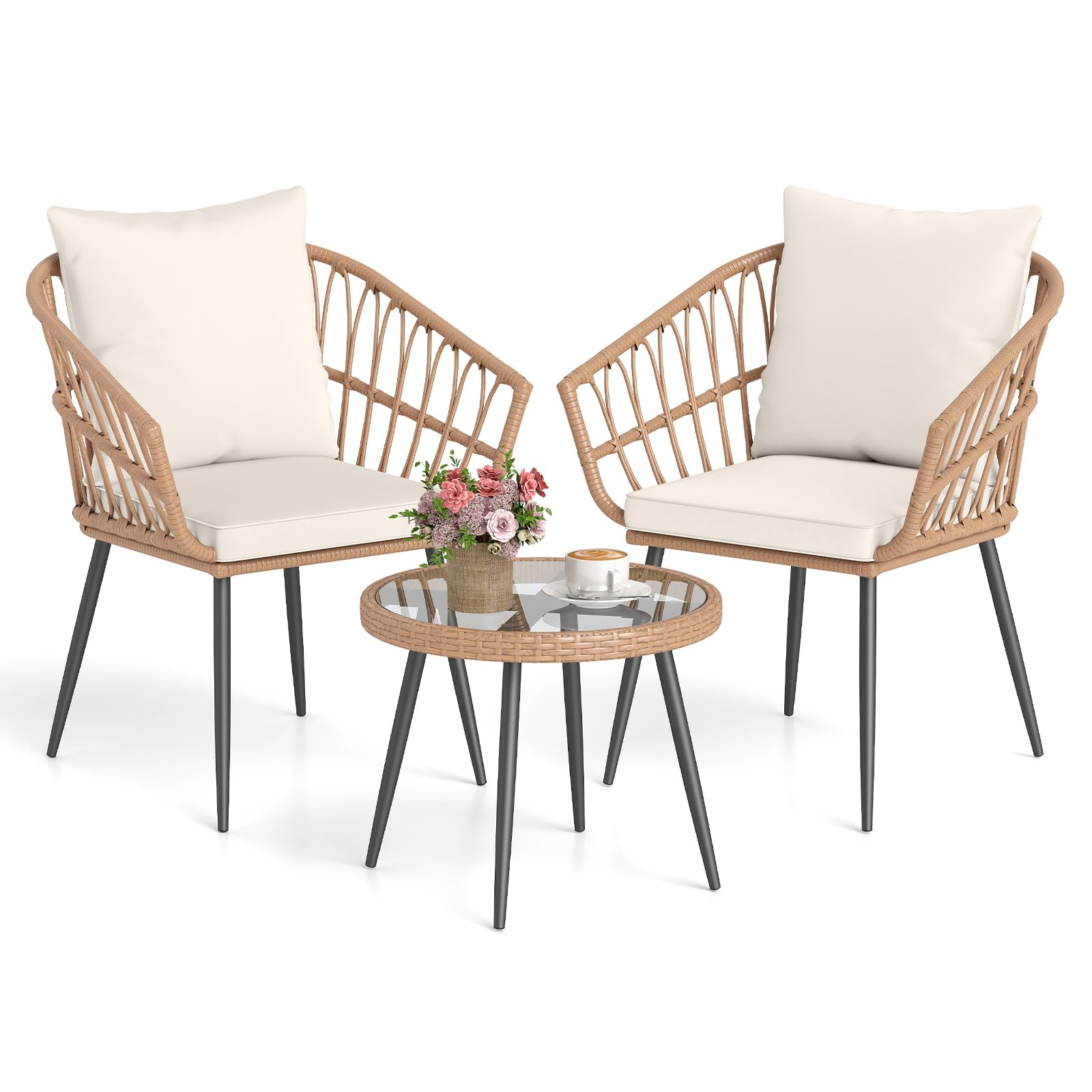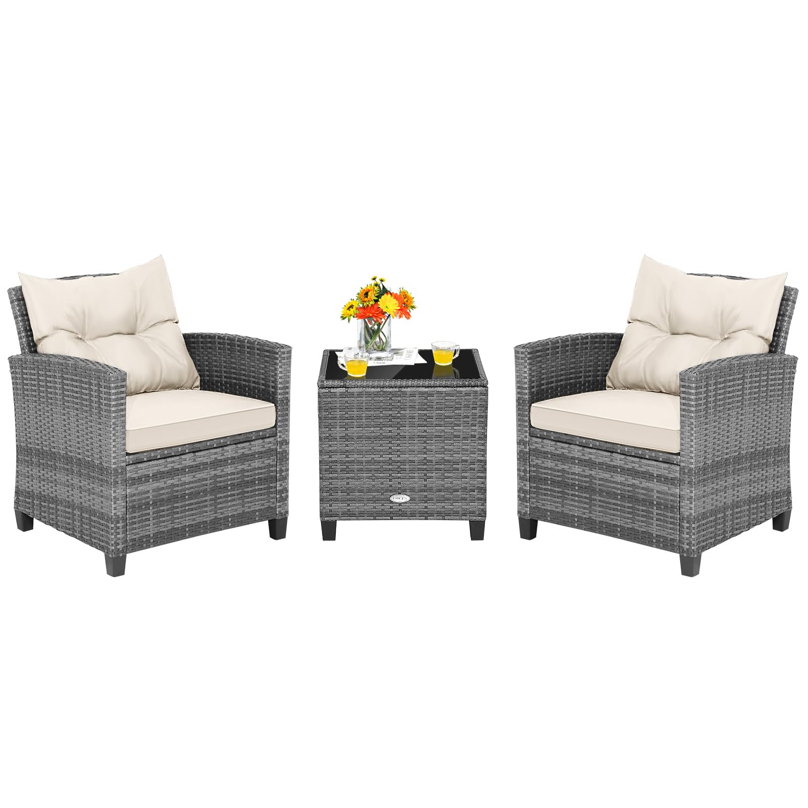 Tangkula 3 Piece Patio PE Rattan Conversation Chairs with Round Glass Table
