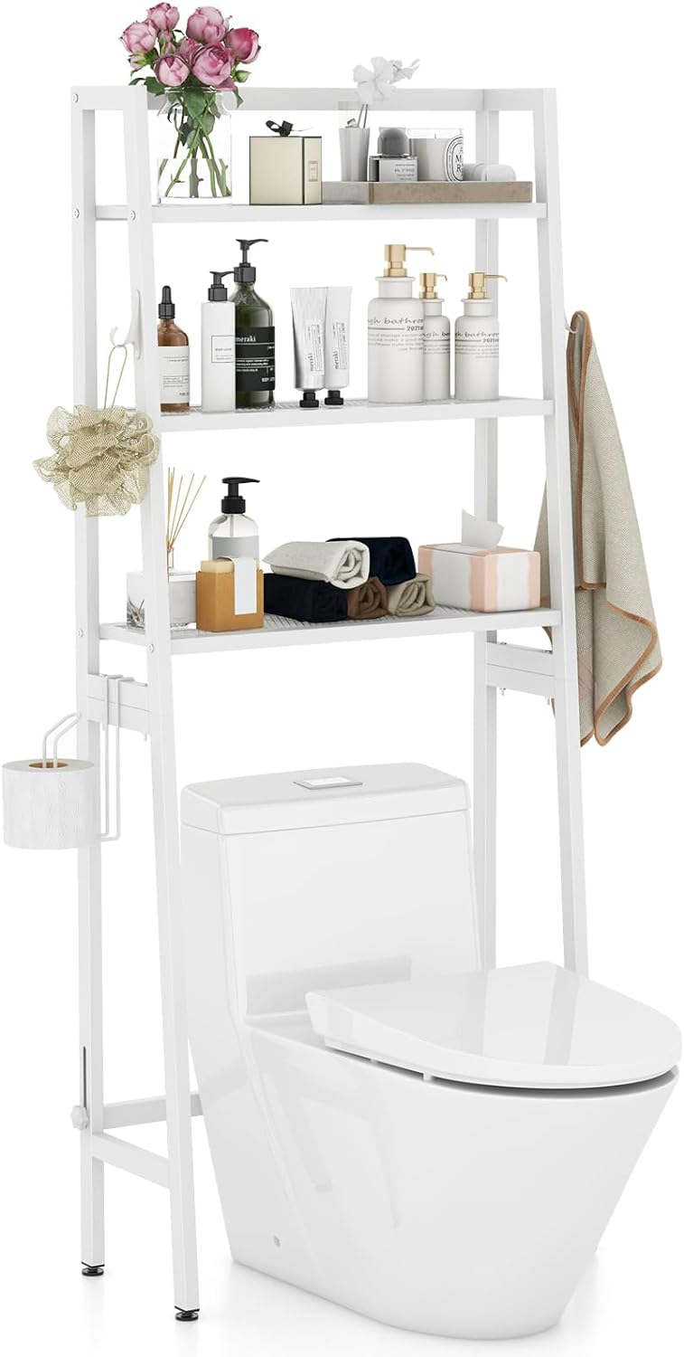 Tangkula Over-The-Toilet Storage Rack, 3-Tier Freestanding Bathroom Space Saver Shelf w/ 2 Hanging Hooks