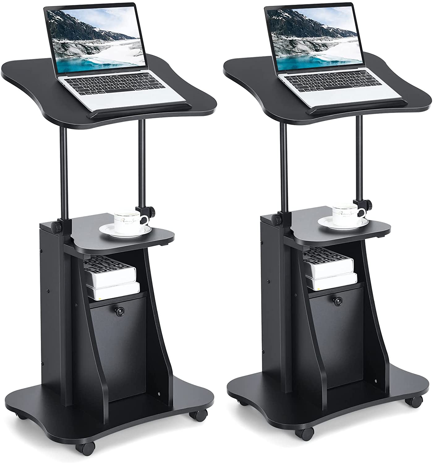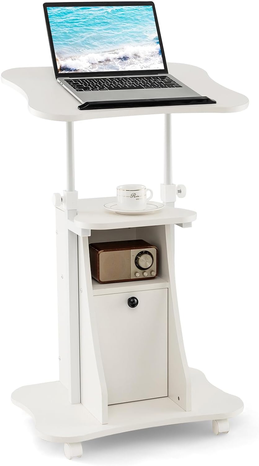 Mobile Laptop Podium, Height Adjustable Sit to Stand Desk with Tilting Desktop & Storage Cabinet