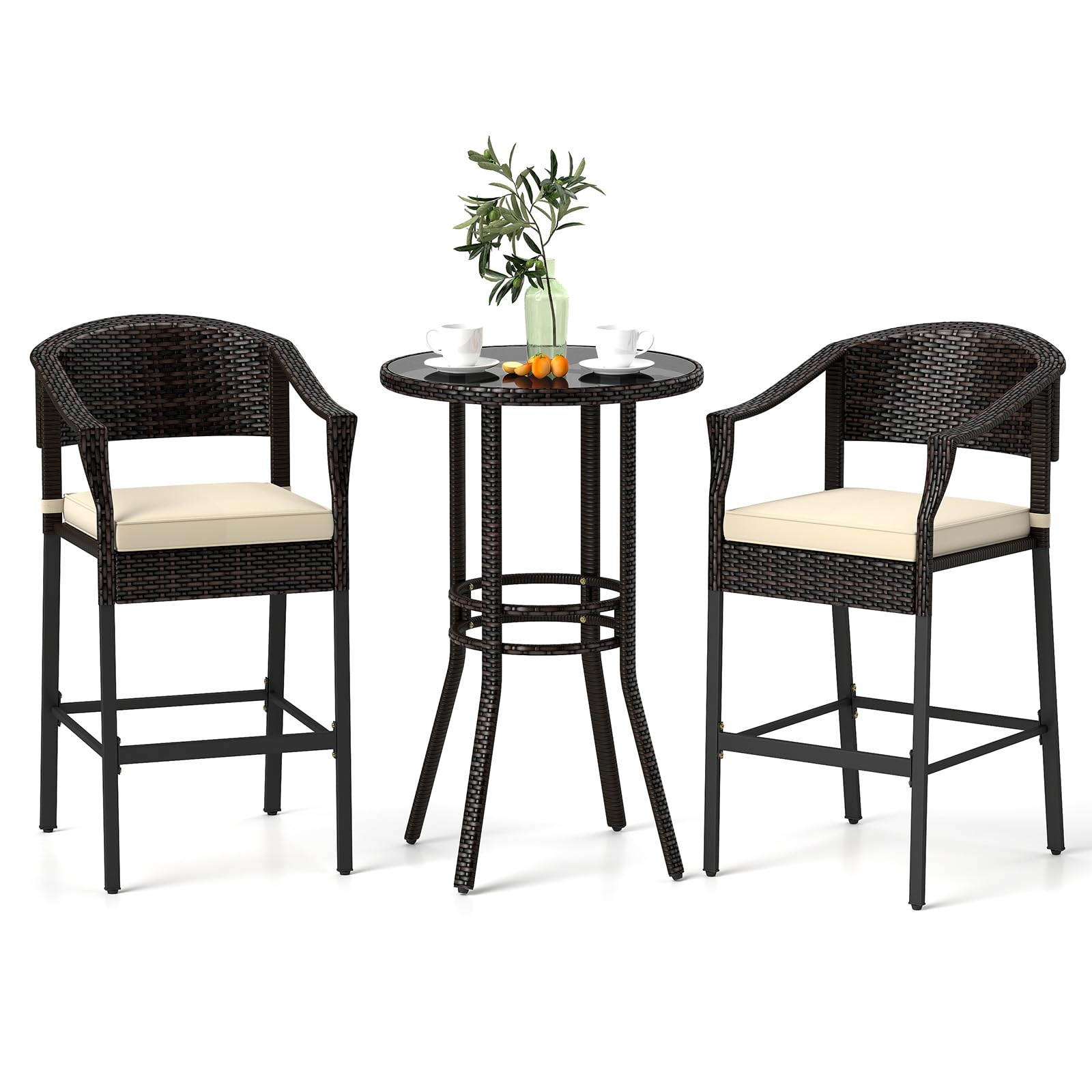 Tangkula 3-Piece Patio Rattan Bar Set, Wicker Bar Height Armchairs & Round Table w/Tempered Glass Top