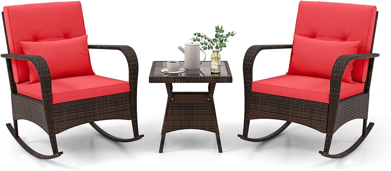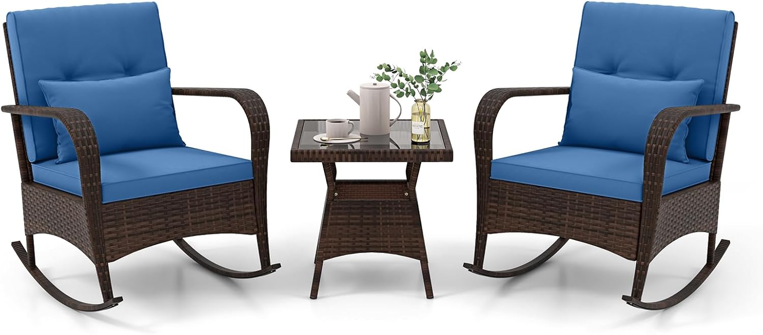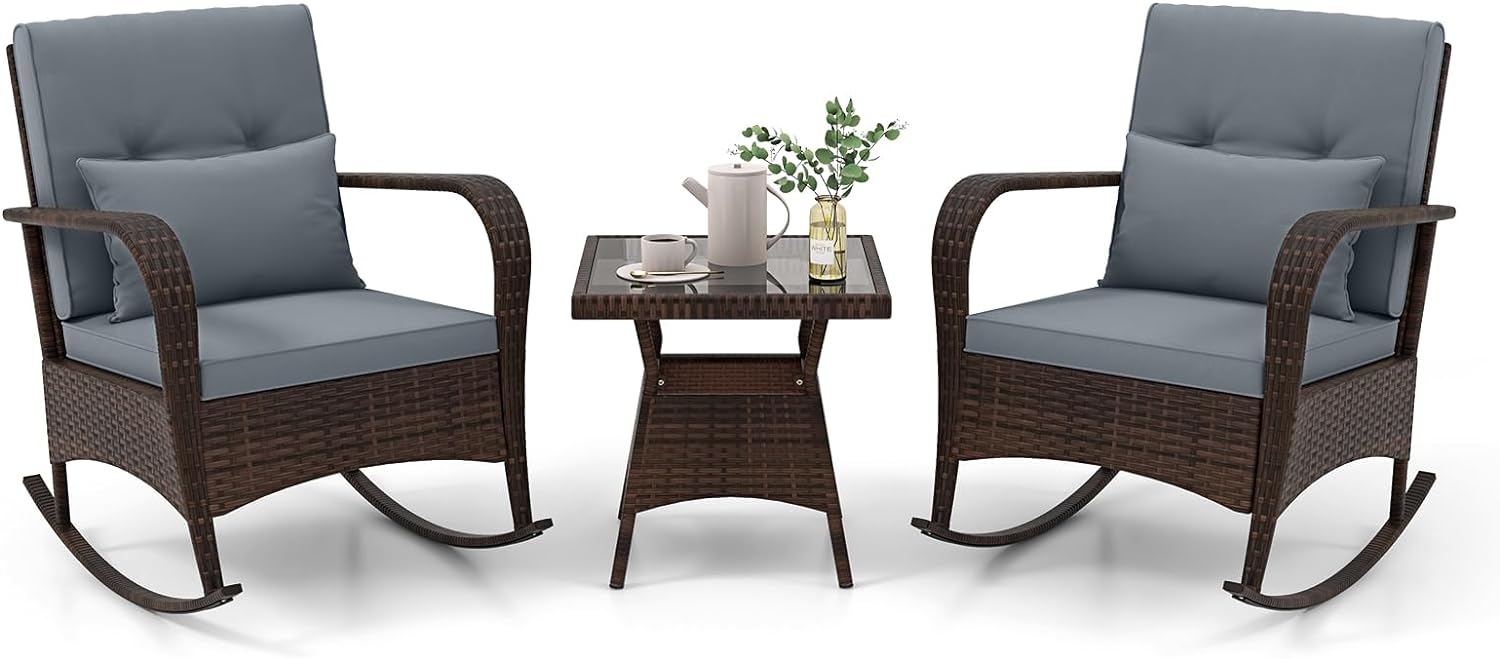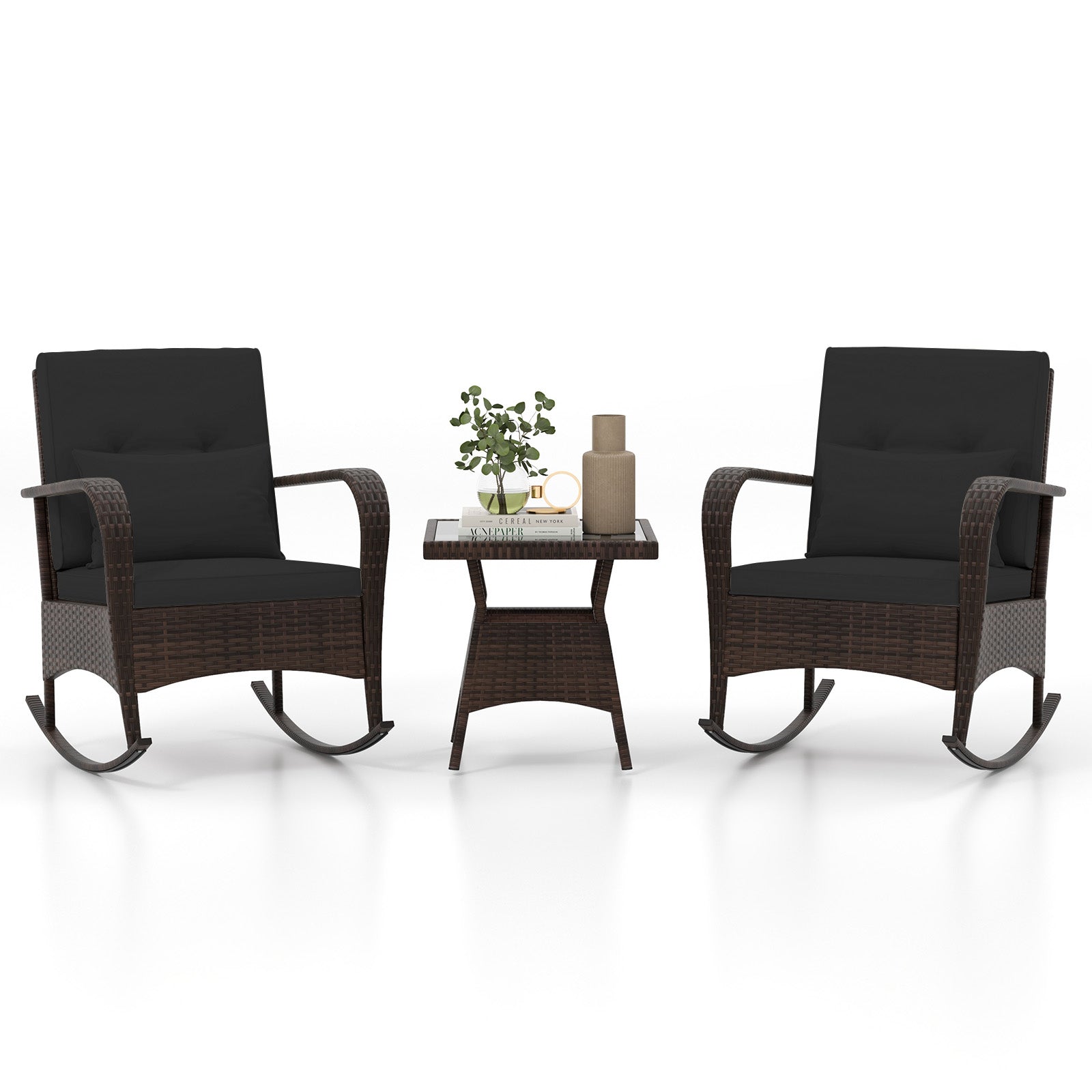 Tangkula 3 Pieces Rocking Bistro Set, Patiojoy Outdoor PE Rattan Rocker Chairs with Removable Cushions & Tempered Glass Top Coffee Table