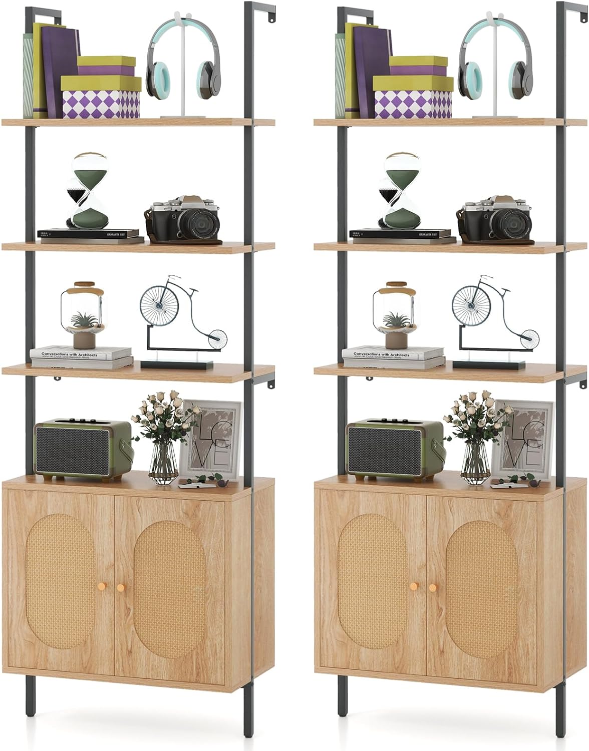 Tangkula 71"H Ladder Bookshelf with Cabinet, Farmhouse 6-Tier Wall Mounted Bookcase with Rattan Cabinet & Metal Frame
