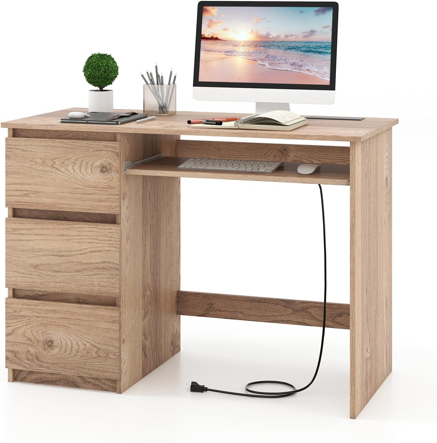 Tangkula Computer Desk with 3 Storage Drawers & Built-in Charging Station, Home Office Desk with Keyboard Tray