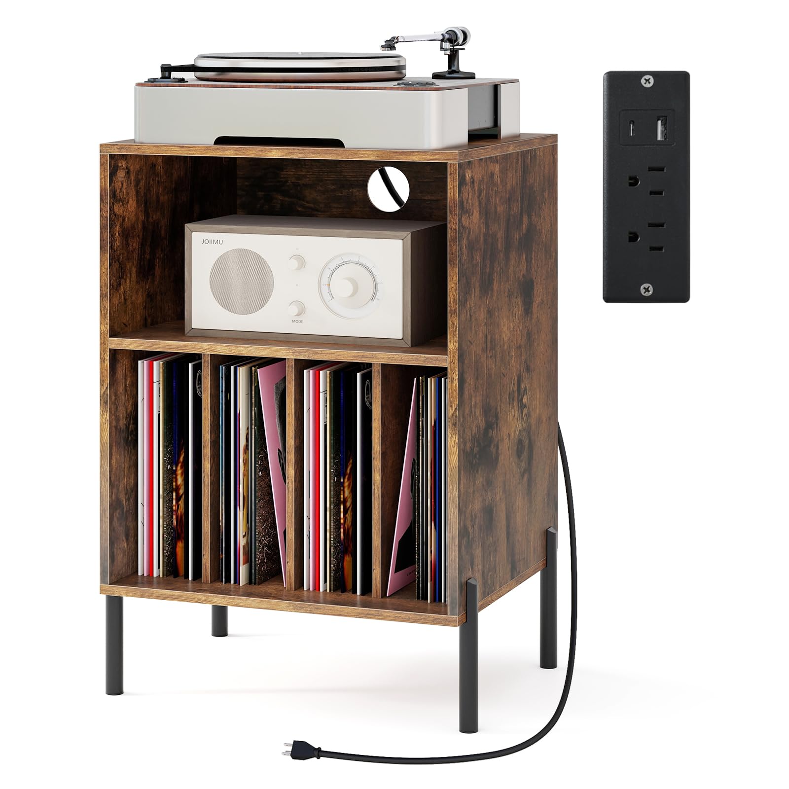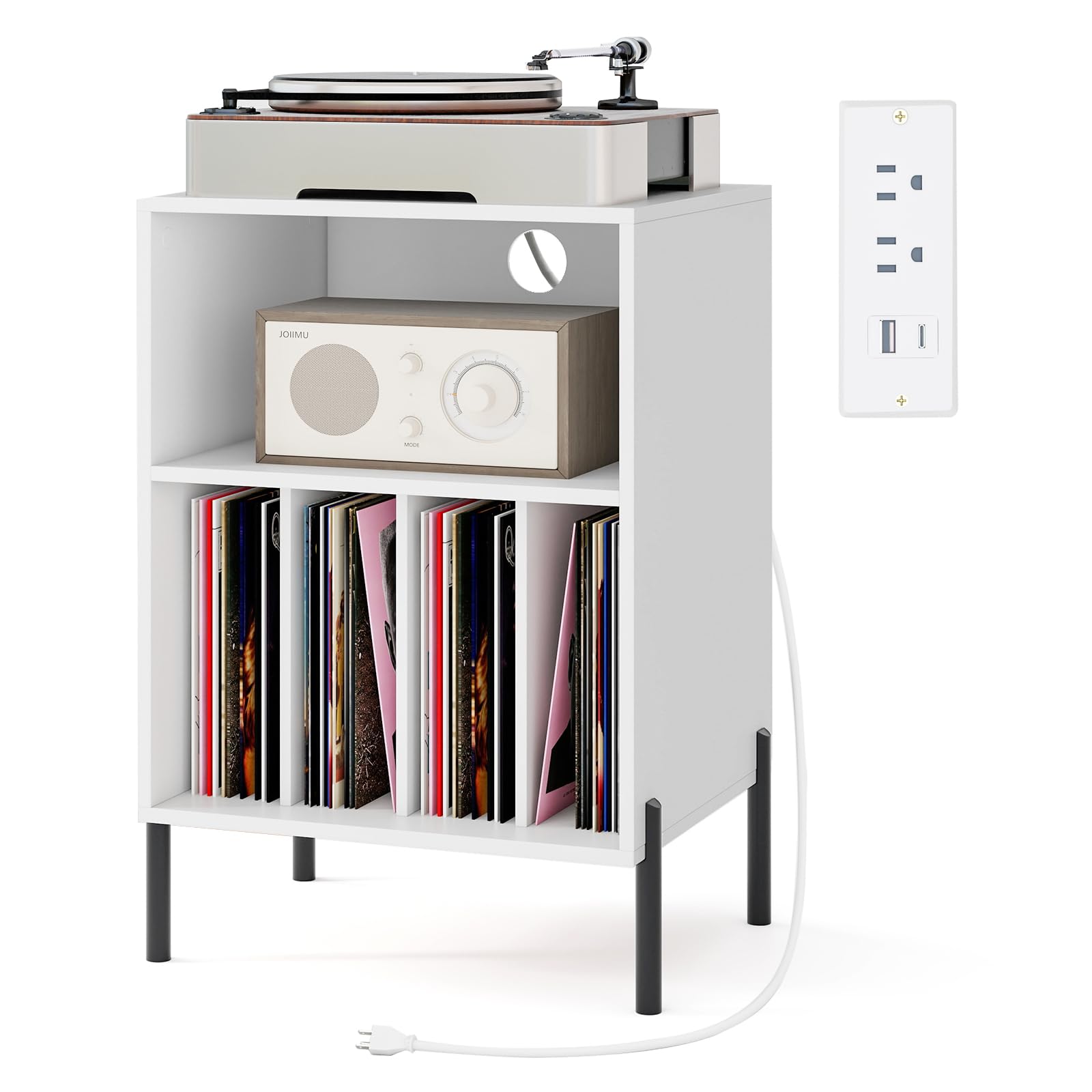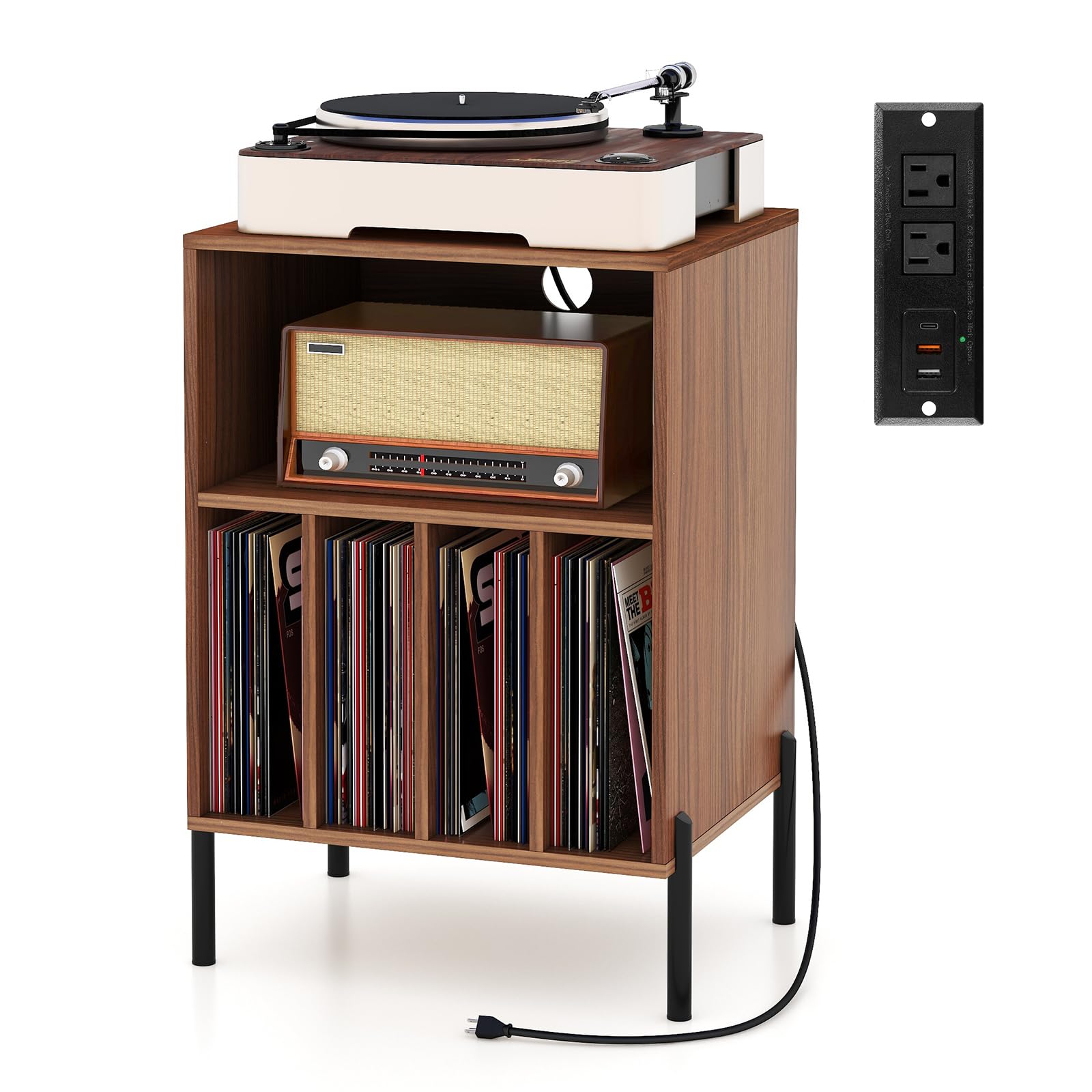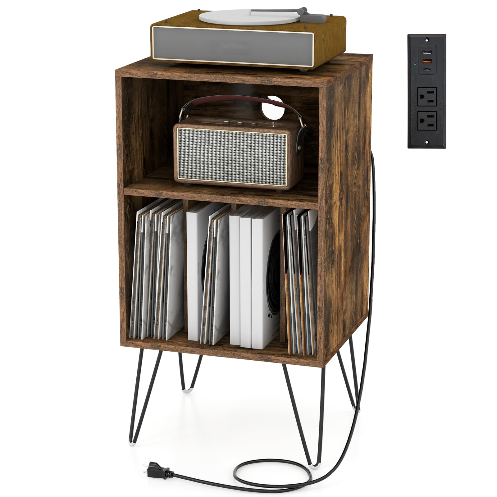 Tangkula Record Player Stand with Charging Station, Turntable Stand with Metal Legs, Vinyl Record Storage Cabinet