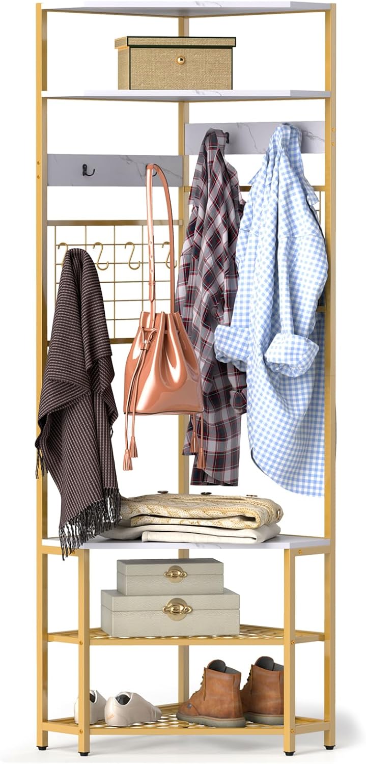 DescriptionSay goodbye to messy entryways with our multipurpose corner coat rack!It combines top storage shelf, coat rack, shoe rack with hanging hooks, creating an all-in one...