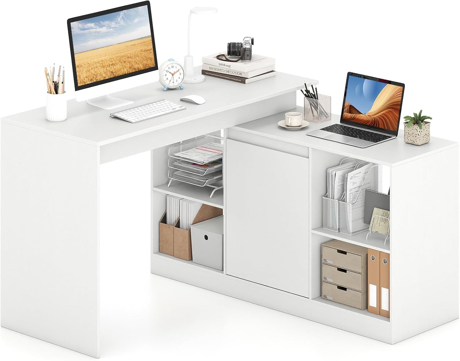 Tangkula L-Shaped Desk with Storage Hutch, Corner Computer Desk with Shelves & Cabinet, White