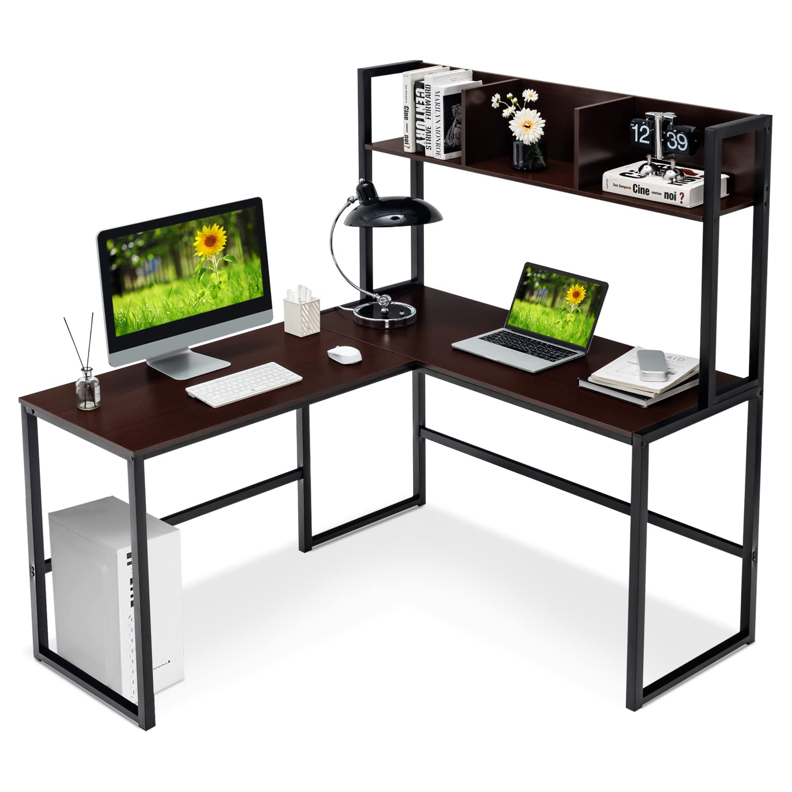 Tangkula Reversible L-Shaped Desk with Hutch, Space Saving Corner Computer Desk with Storage Bookshelf