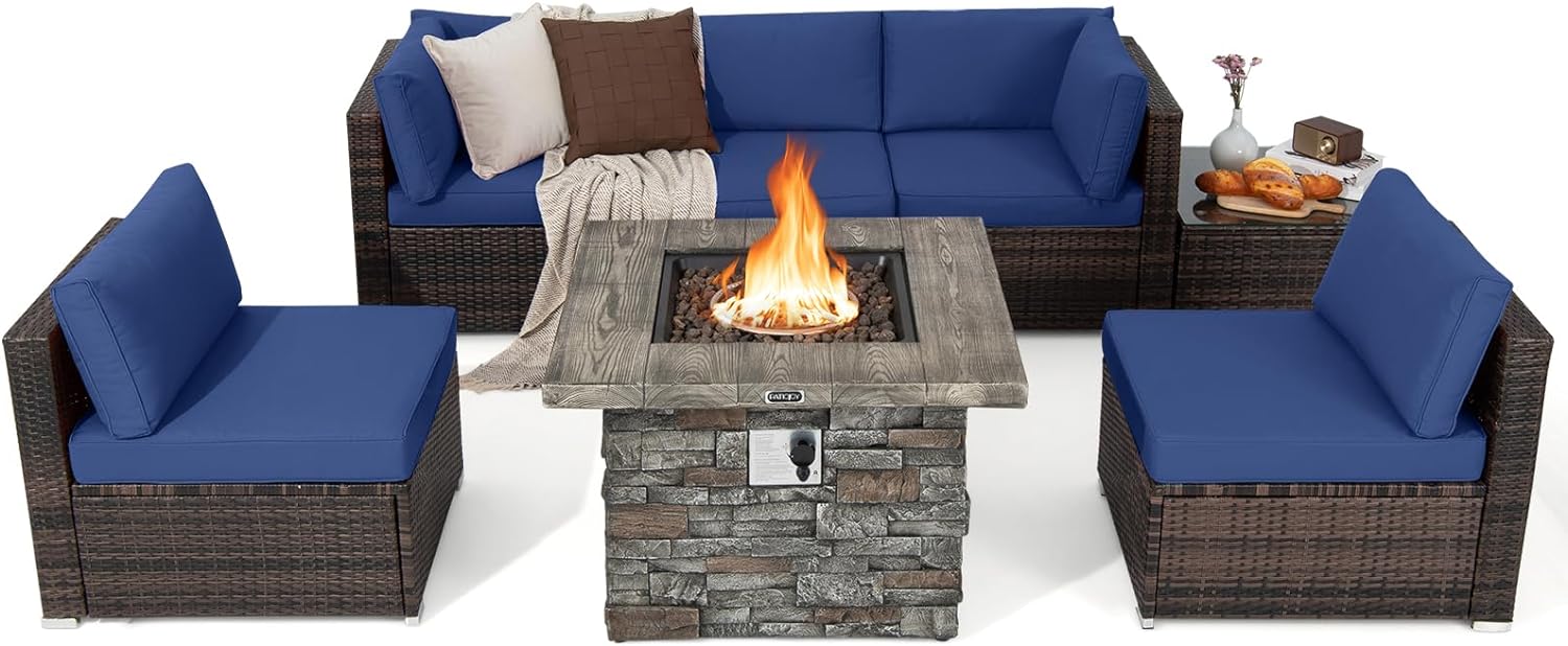 Tangkula 7 Pieces Patio Furniture Set with 50,000 BTU Fire Pit Table, Outdoor PE Wicker Conversation Sofa Set with Cushions