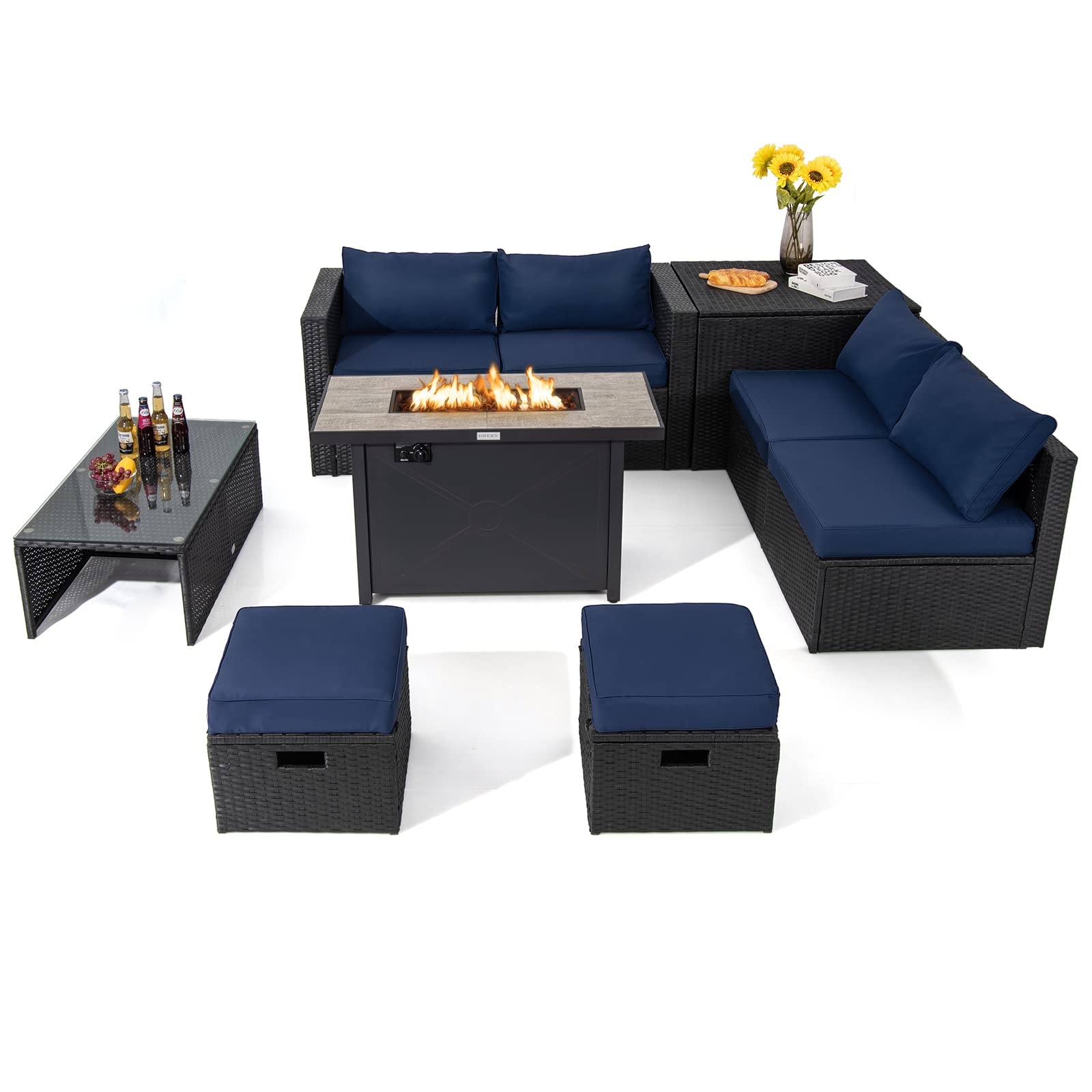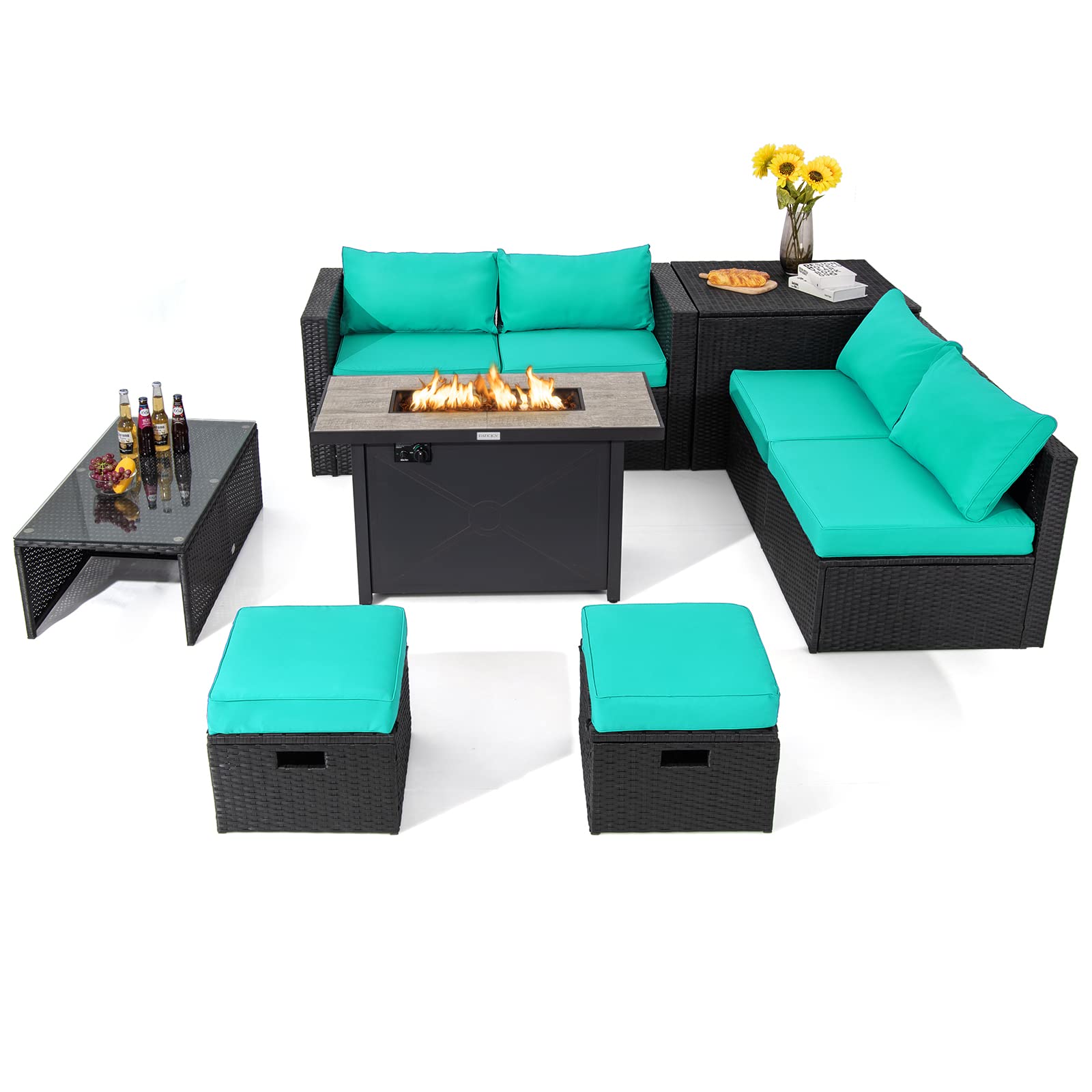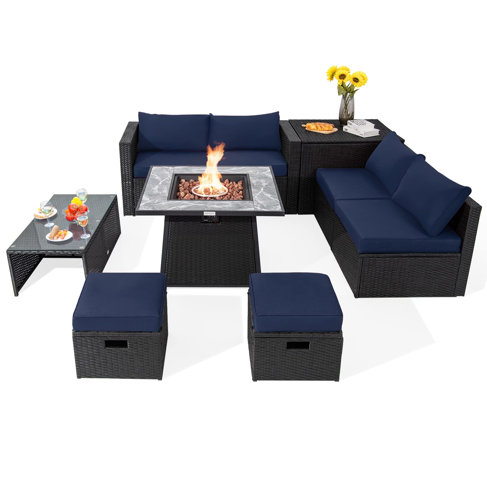 Tangkula 9 PCS Patio Furniture Set with 42” 60,000 BTU Fire Pit, Outdoor Space-Saving Sectional Sofa Set with Storage Box
