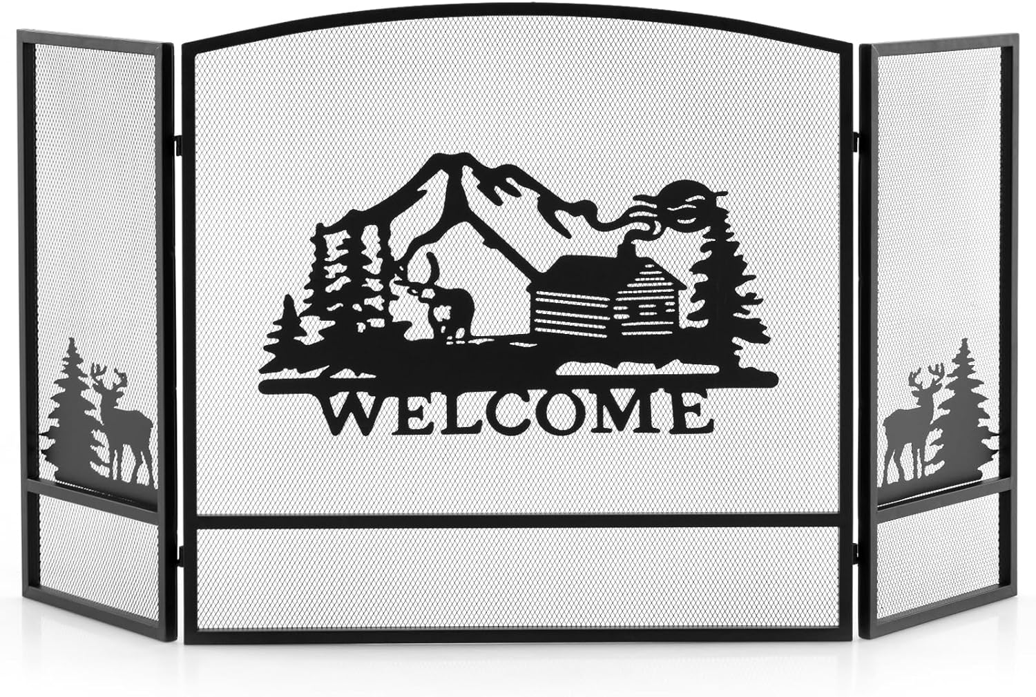 【Forest Moose Decorative Screen】This fireplace fence features appealing and vivid patterns: a mountain hut on the middle panel and forest deer on the 2 side panels....