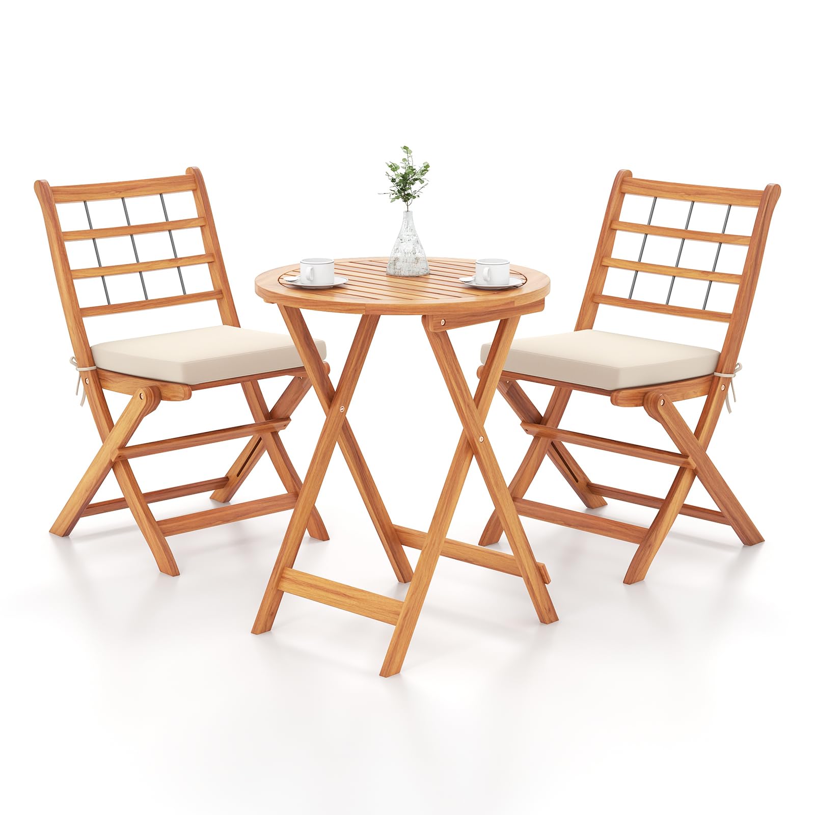 Tangkula 3 Piece Patio Wood Bistro Set, Folding Table Chair Set w/Soft Seat Cushions