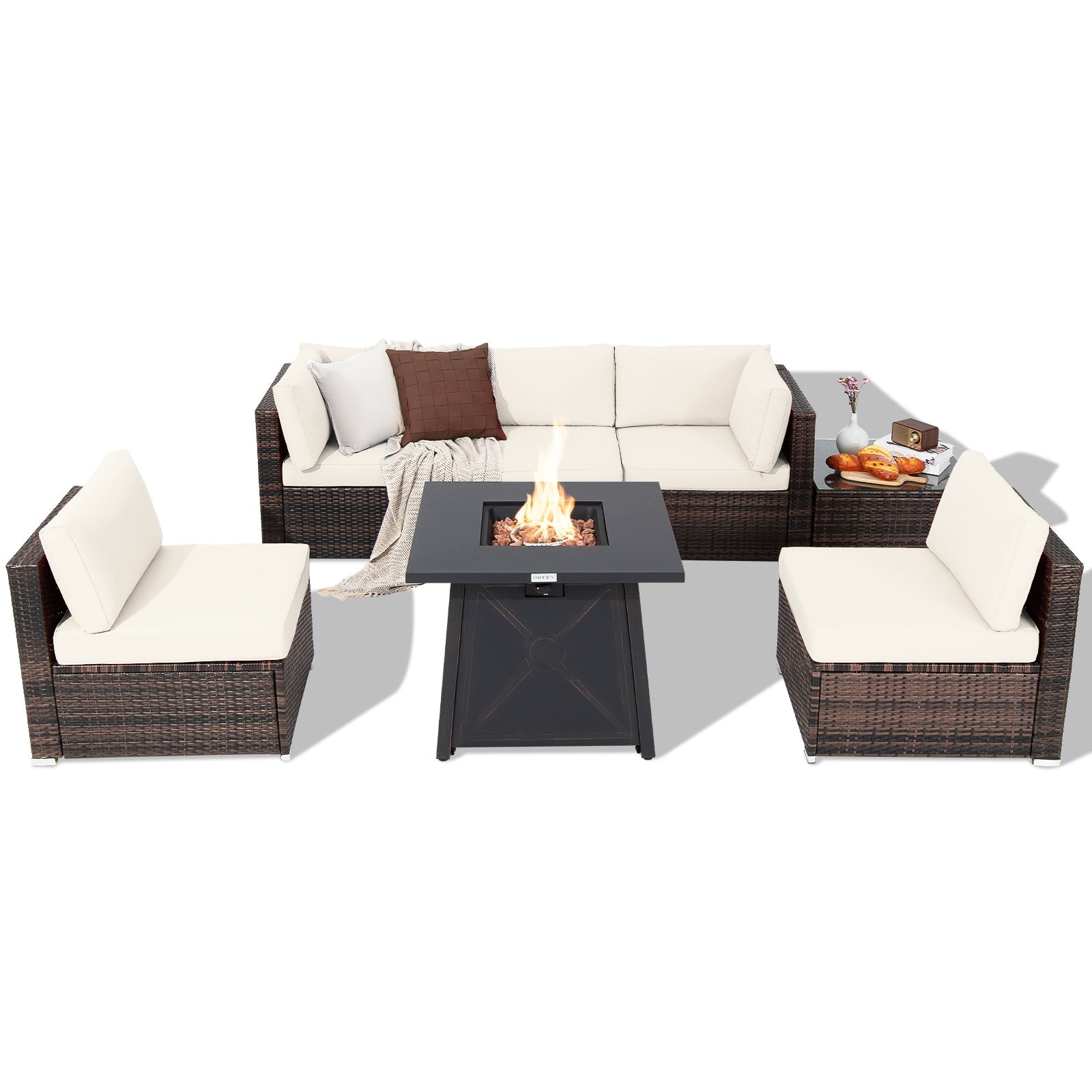 Tangkula 7 Piece Patio Furniture Set w/Fire Pit Table, Patiojoy Outdoor Rattan Conversation Sofa Set