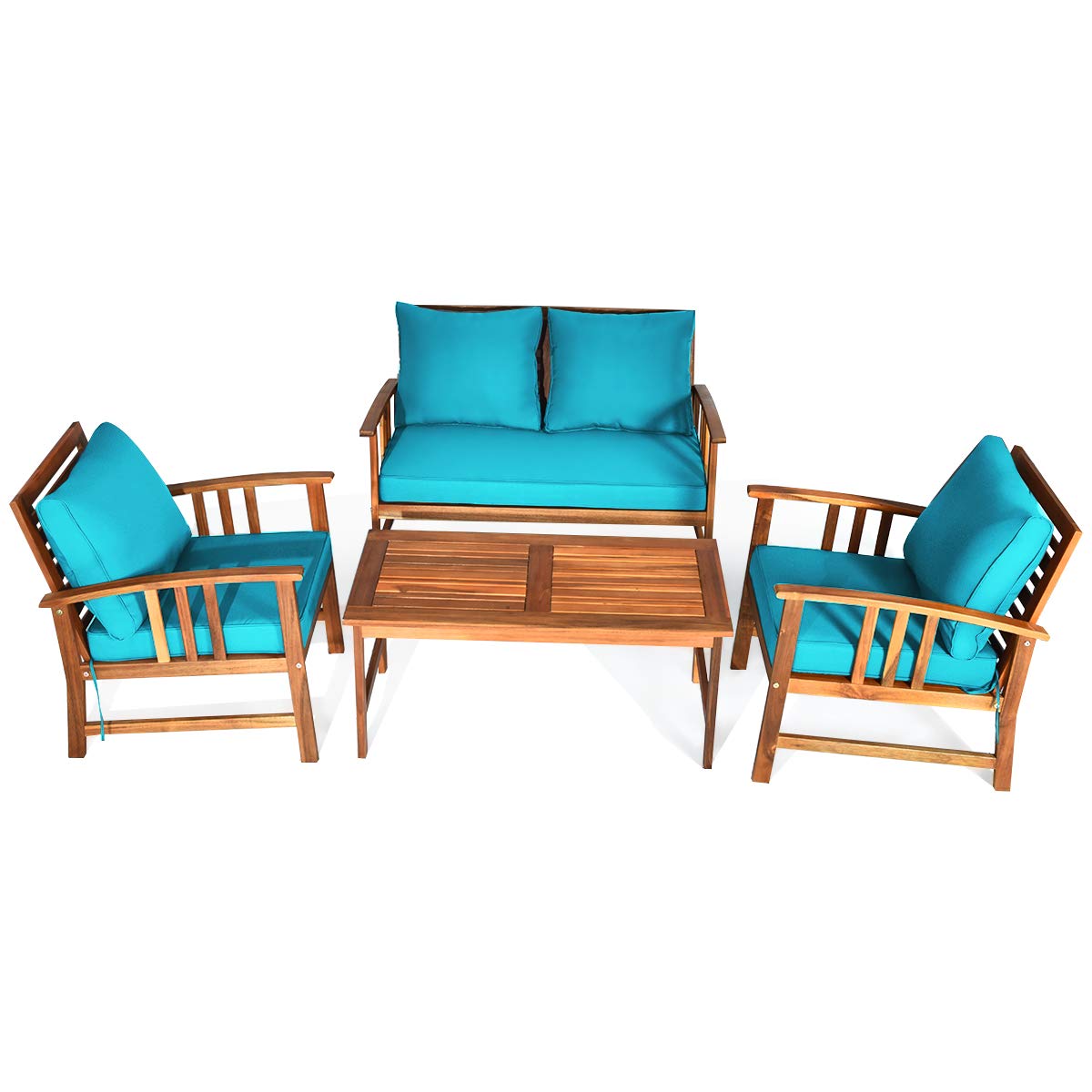Tangkula 4 PCS Acacia Wood Patio Furniture Set, Outdoor Seating Chat Set with Gray Cushions & Back Pillow