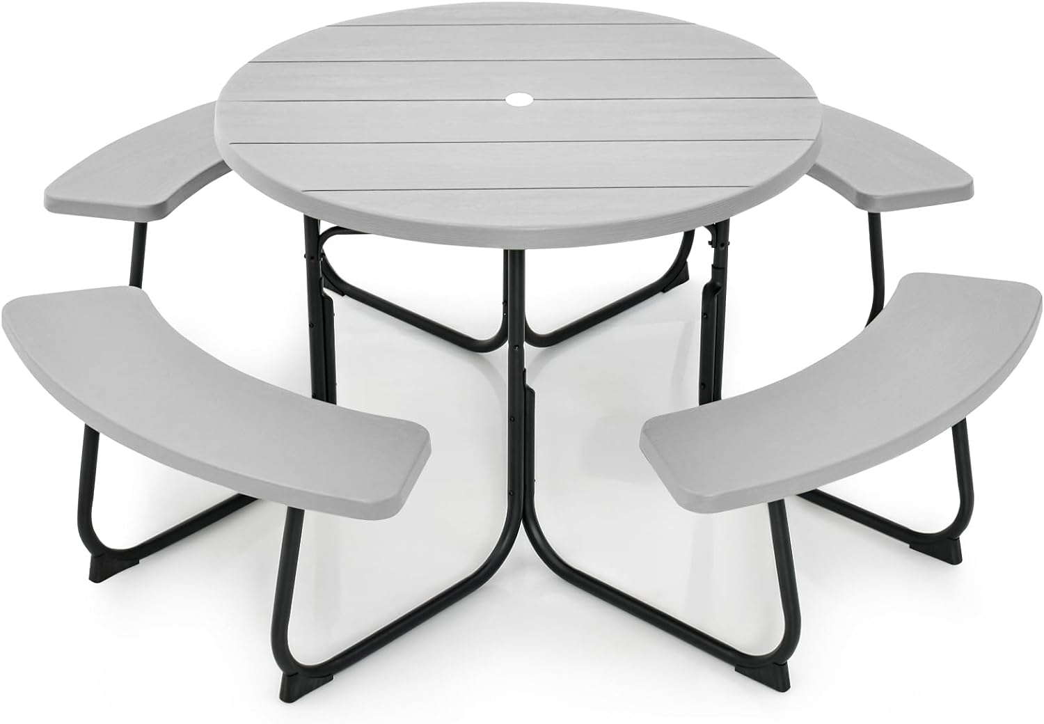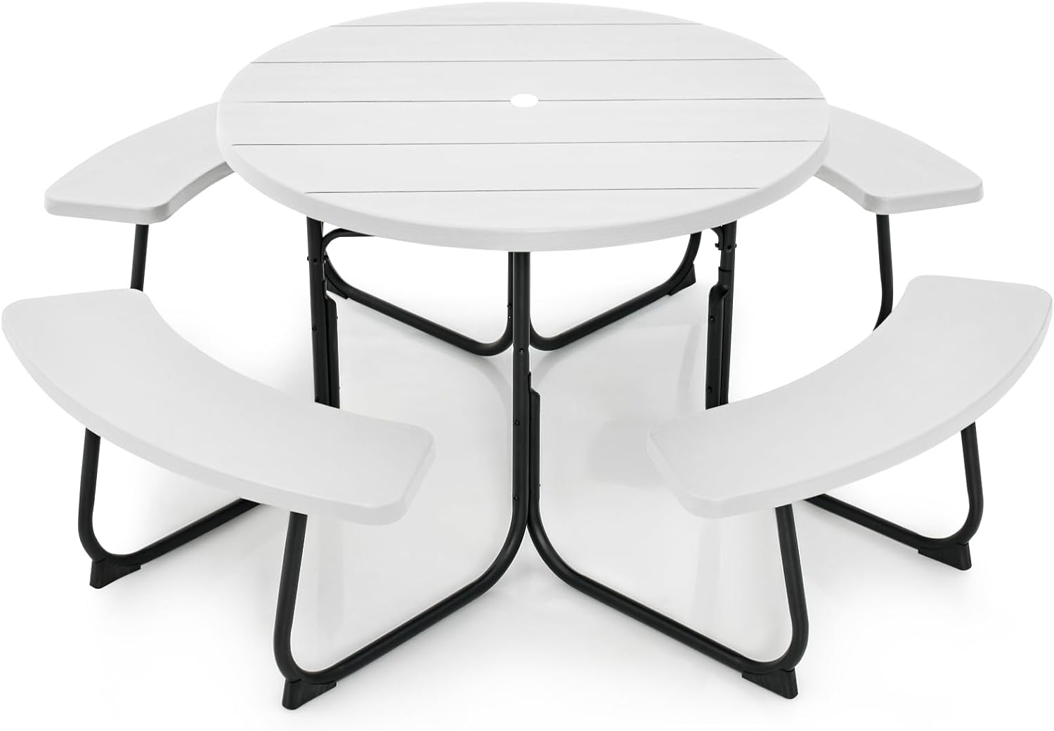 Tangkula 8 Person Picnic Table, Outdoor Round Picnic Table with 4 Built-in Benches, Umbrella Hole