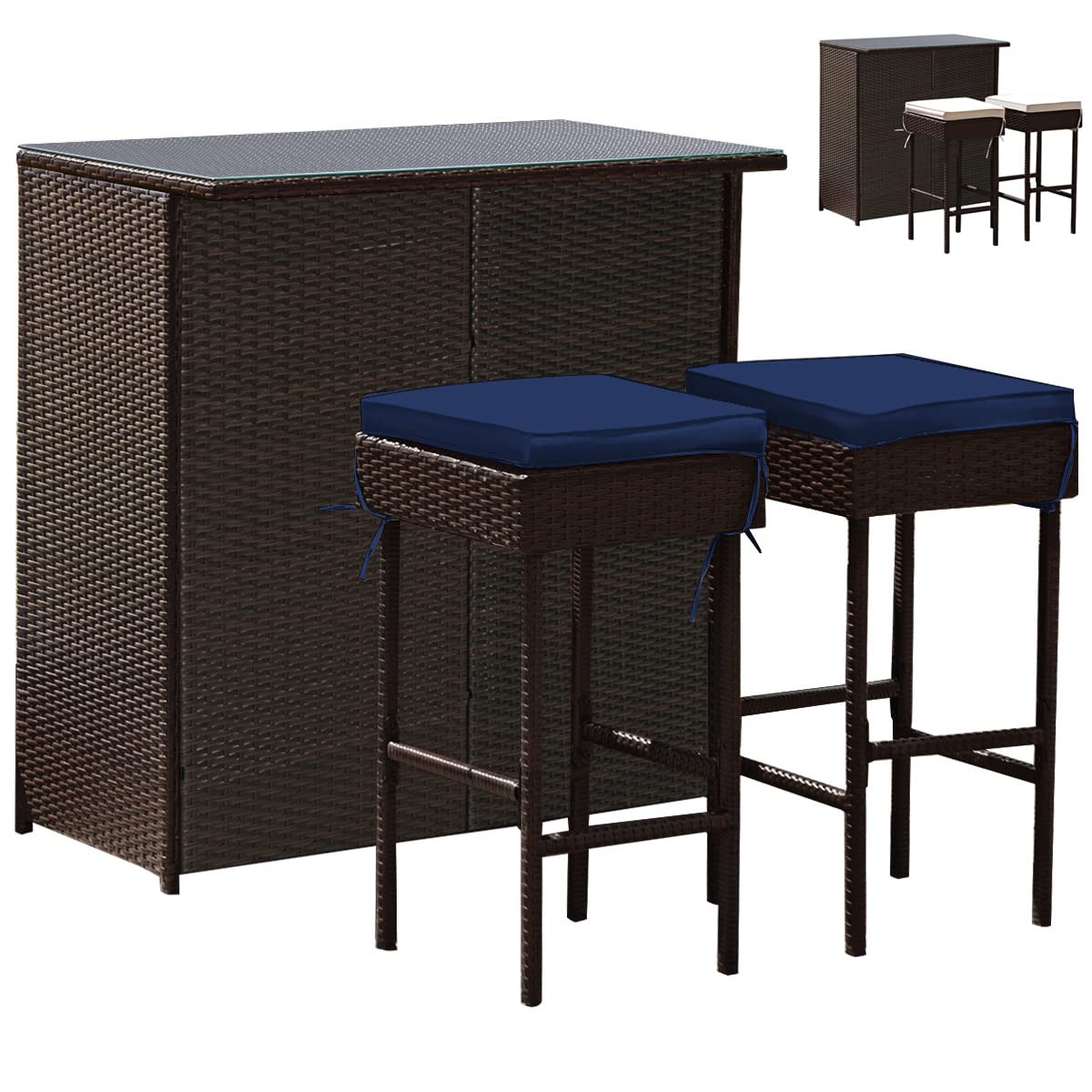 Tangkula Patio Bar Set, 3 Piece Outdoor Rattan Wicker Bar Set with 2 Cushions Stools & Glass Top Table