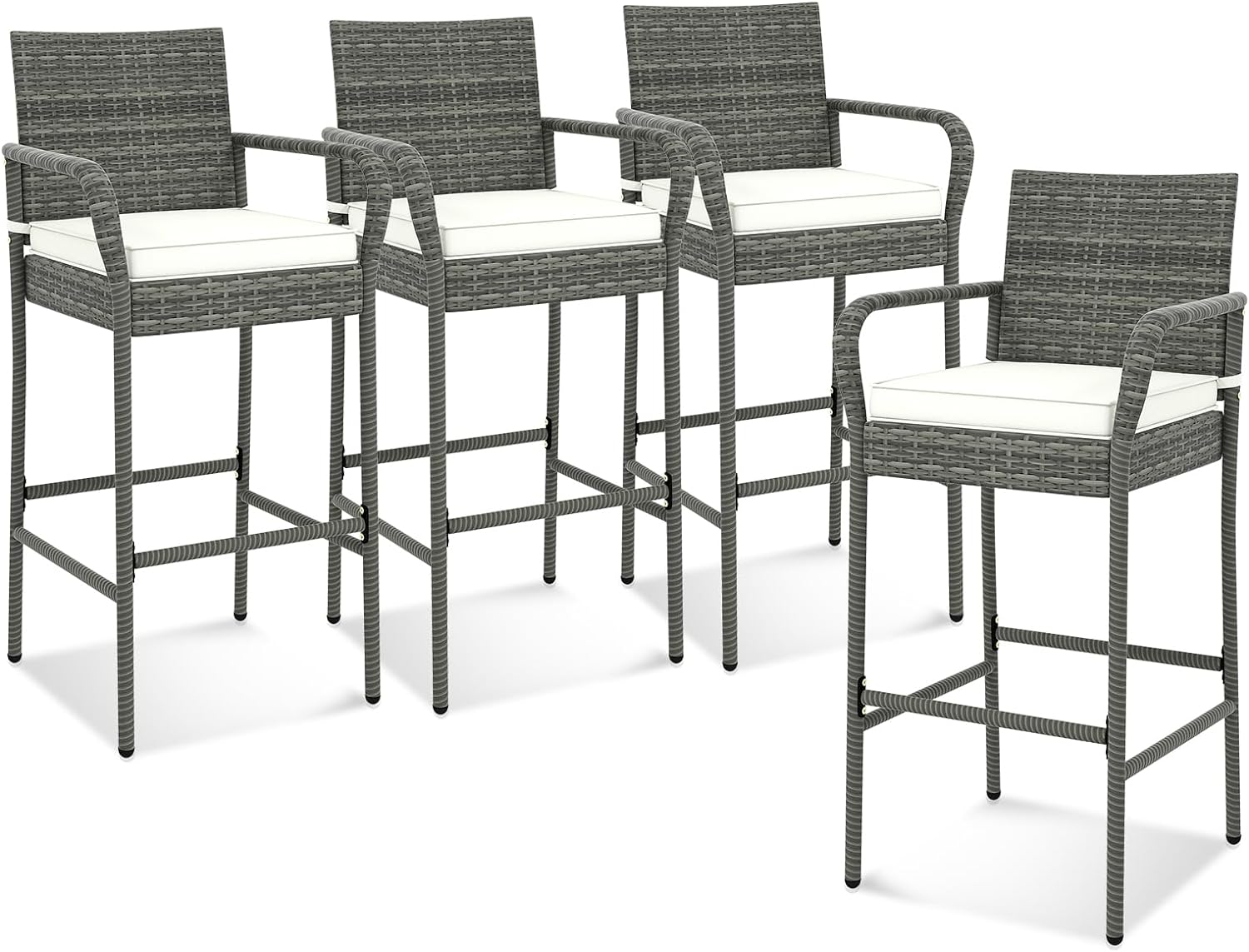 Tangkula Patio Wicker Barstools Set of 2, Outdoor PE Rattan Bar Chairs with Armrests & Soft Cushions