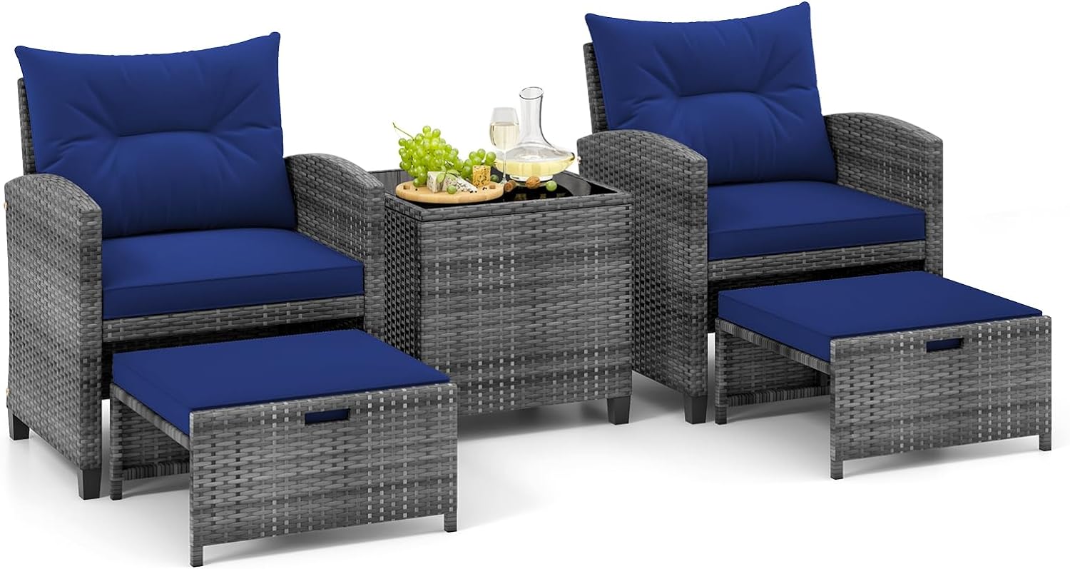 Tangkula 5 Piece Patio Furniture Set, Patiojoy Wicker Chair Set with Coffee Table & 2 Ottomans (Navy)
