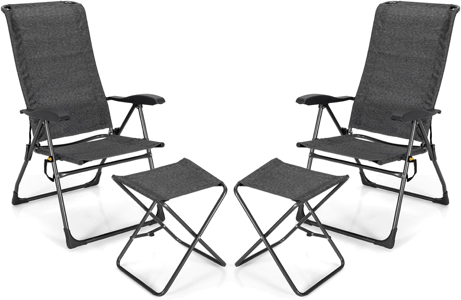 Tangkula Folding Patio Chairs, Set of 2 Outdoor Dining Chairs & Ottomans, Lawn Chairs with 7-Level Adjustable Backrest