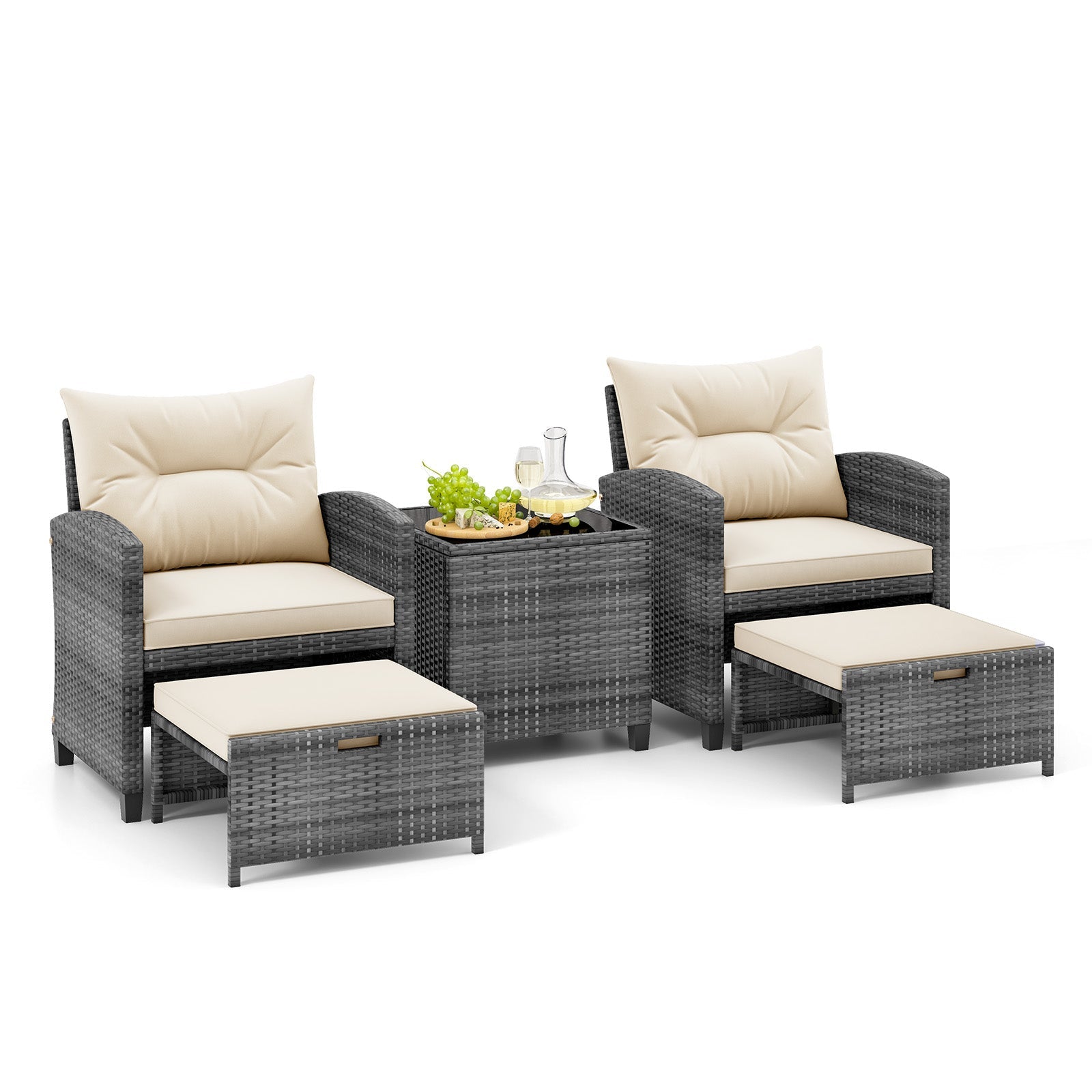 Tangkula 5 Piece Patio Rattan Furniture, Wicker Cushioned Chairs Set w/ 2 Ottomans & Tempered Glass Coffee Table