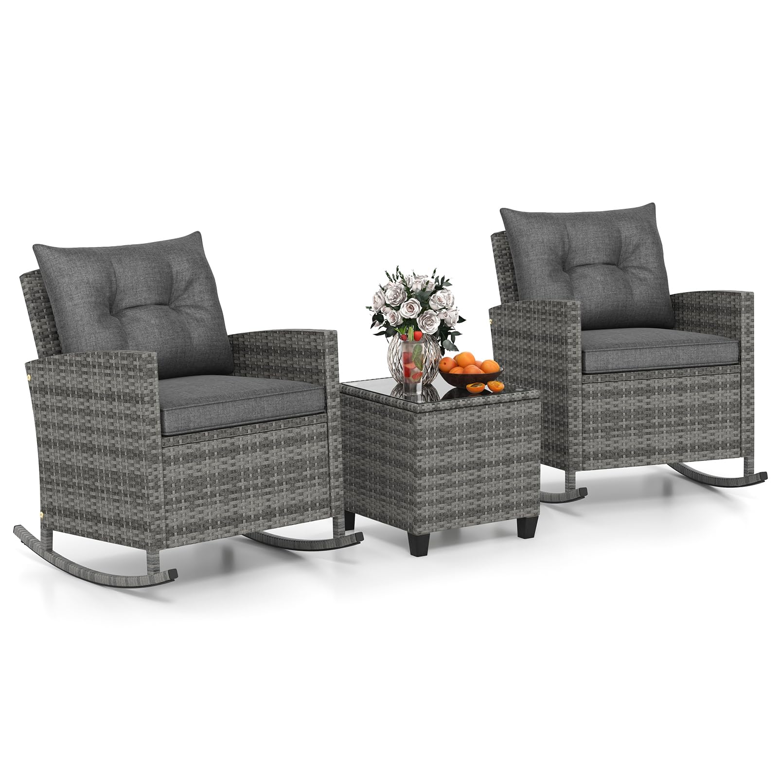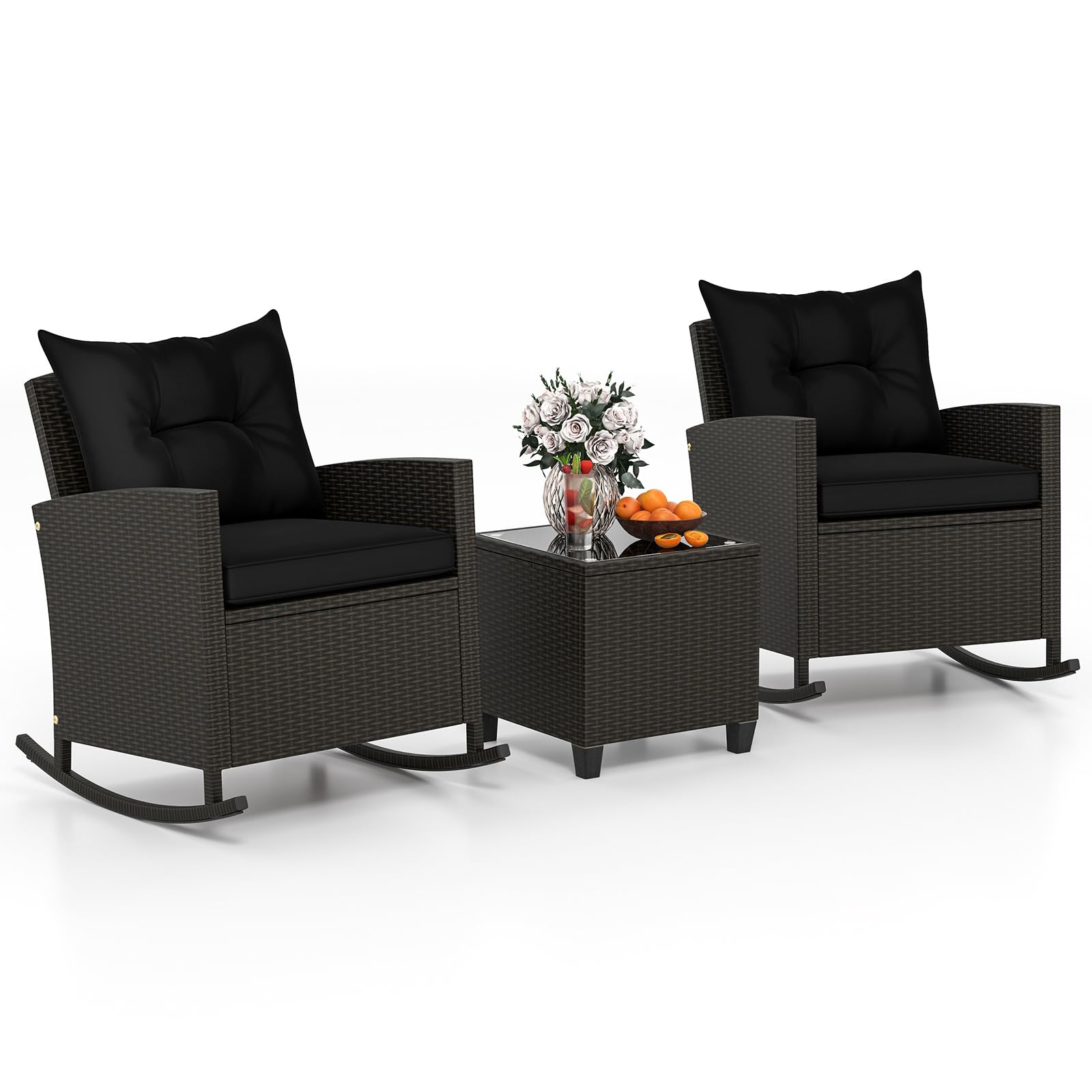 Tangkula 3 Piece Wicker Rocking Set, Patio Rattan Roker Chairs with Tempered Glass Table & Soft Cushions