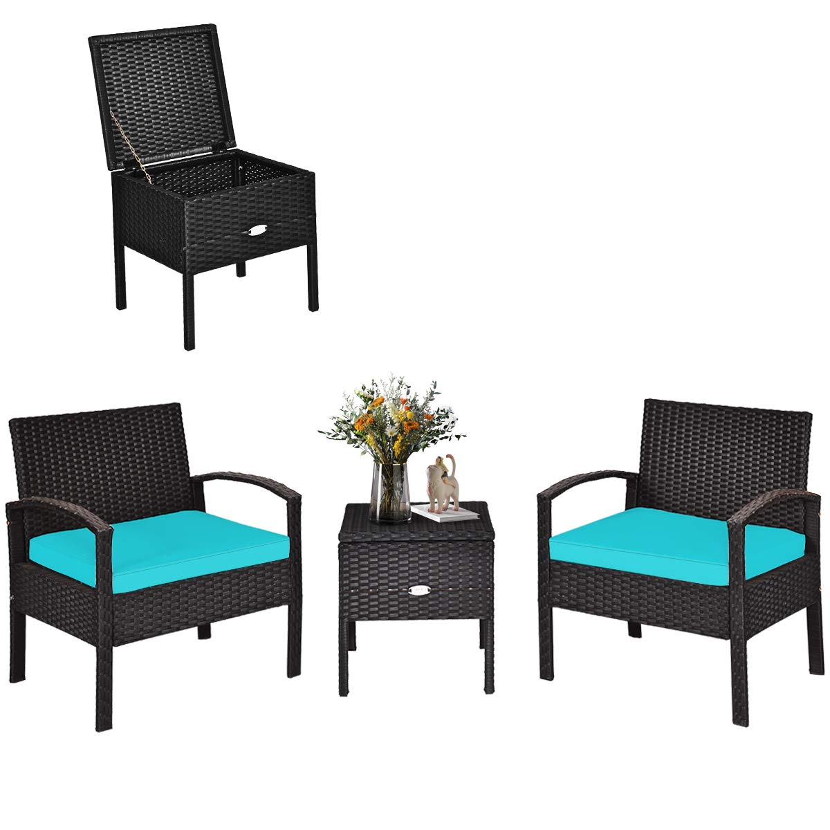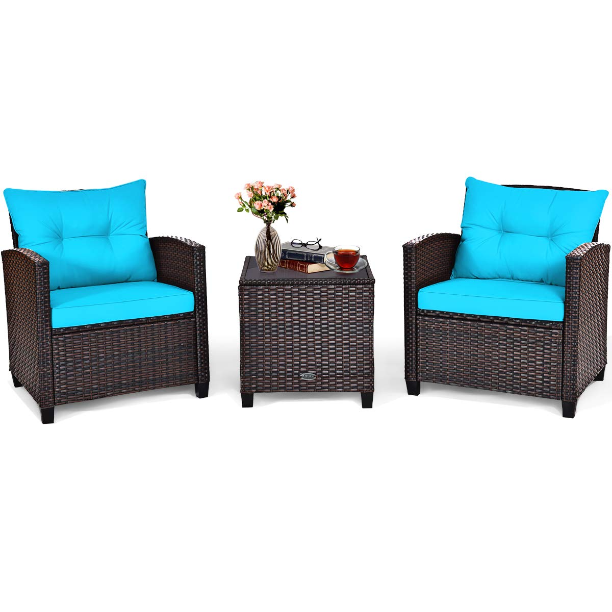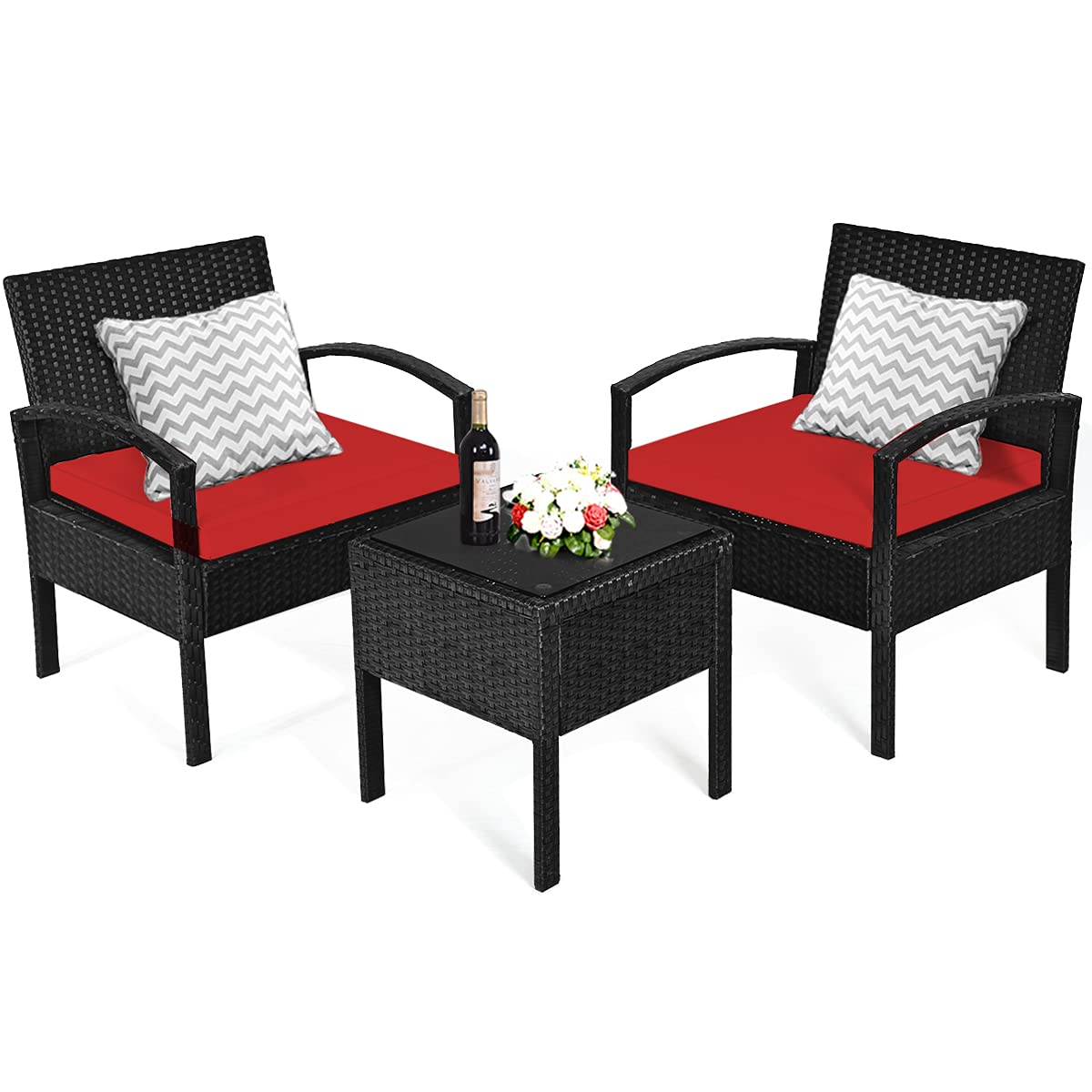 Tangkula 3 Pieces Patio Furniture Set Outdoor Rattan Wicker Coffee Table & Chairs Set with Seat Cushions