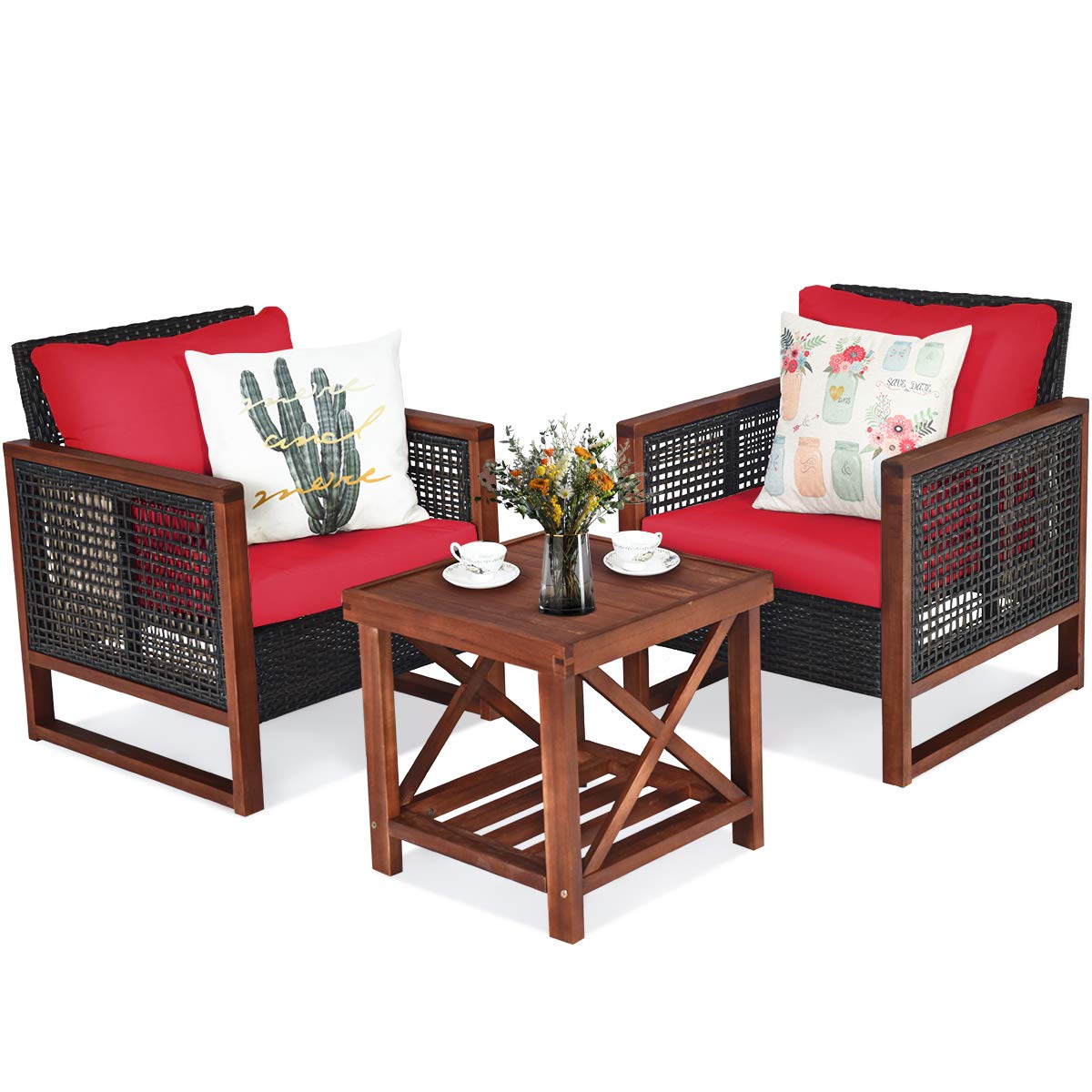 Tangkula 3 in 1 Acacia Wood Loveseat with Separable Coffee Table, 3-Piece Wooden Chairs Set with Cushions