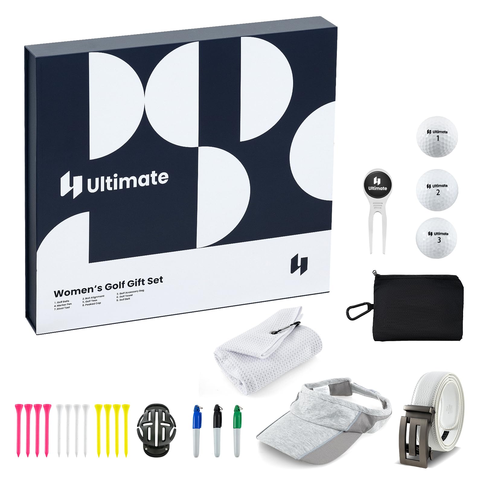 Description Enhance your golfing experience with this all-inclusive golf set featuring essential accessories like golf balls, tees, markers, a divot tool, towel, hat, belt, and accessory...