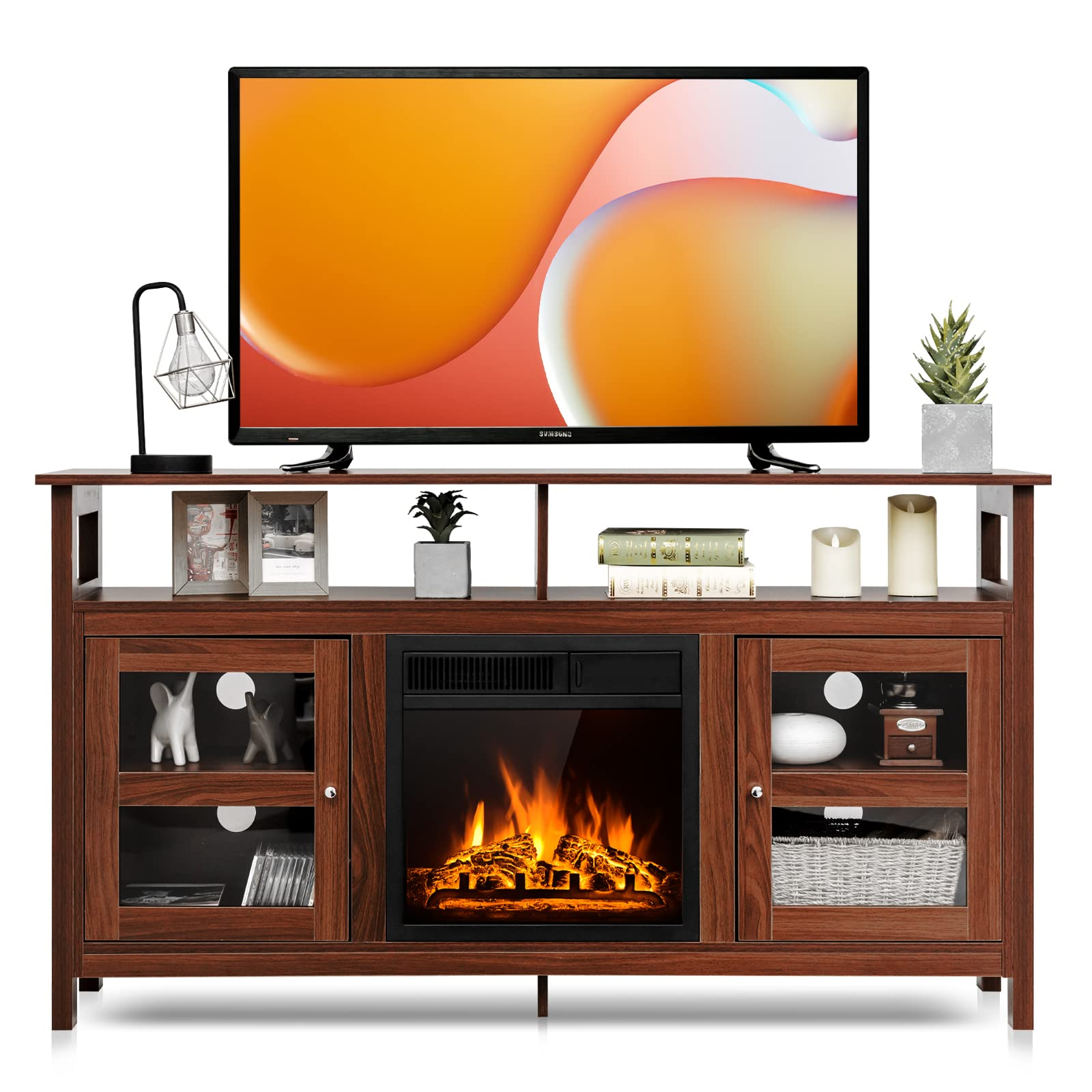 Tangkula 58” Fireplace TV Stand Home Entertainment Center with 18” 1400W Electric Fireplace