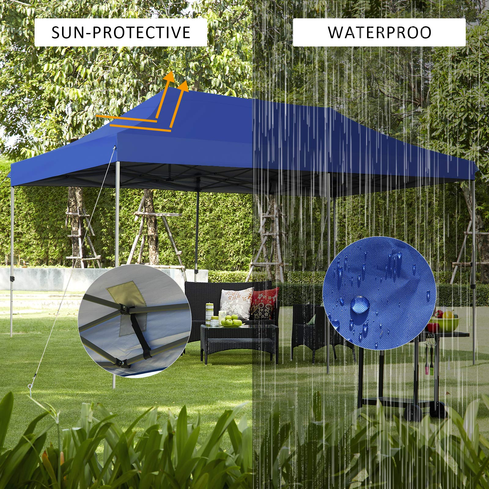 - Large Shade Coverage: This 10’ x 20’ folding canopy tent provides 200 square feet of shading area for about 20 people. You can place tables, recliners, and rattan conversation sets under the canopy to enjoy leisure time. It is ideal for outdoor activities such as parties, picnics, trade exhibitions, etc.