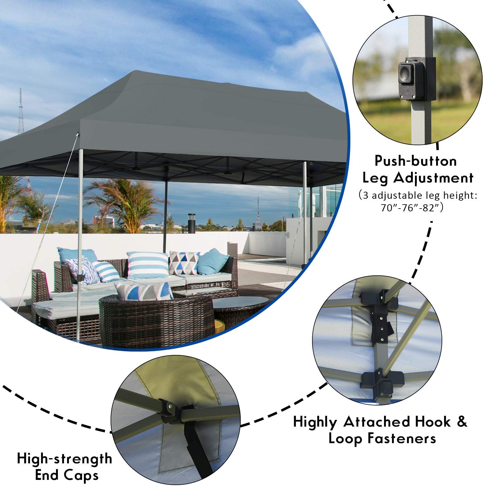 - Sturdy Frame with Adjustable Height: The powder-coated steel frame provides stable support while preventing rust. Each canopy is equipped with guy ropes and ground spikes to better resist strong winds. In addition, the no-pinch push buttons allow you to freely adjust the leg height in three settings of 70", 76", and 82" according to different needs.