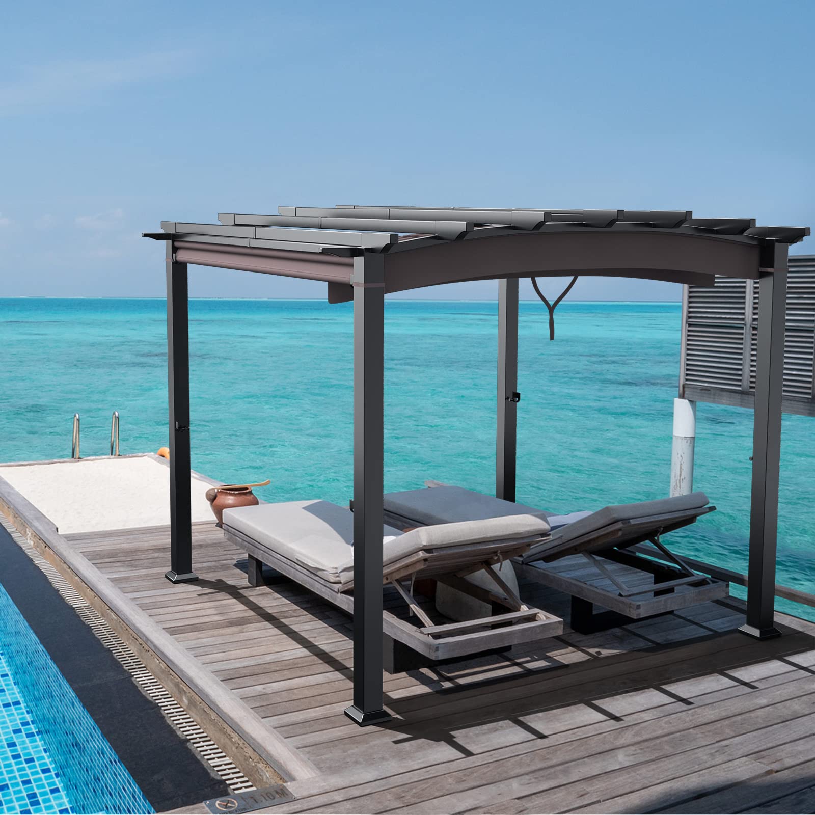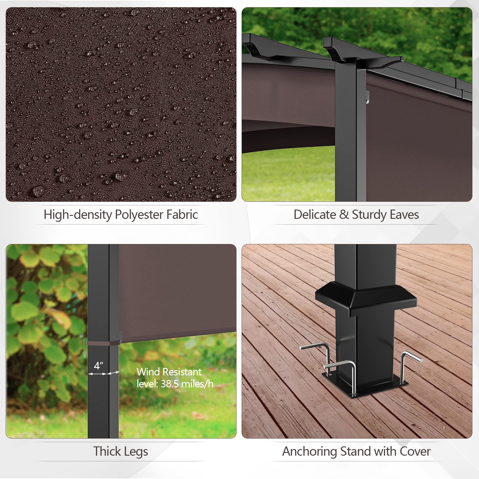 If you want to create a cool and cozy corner for outdoor leisure life, our patio pergola gazebo will be a good choice for you. This outdoor canopy could cover a large area, which is big enough to cover a full outdoor furniture set. It could accommodate 6 to 8 people at the same time. With 3 retractable canopies, this patio sun shelter can fully block out annoying sunlight all day. You can pull the rope loop to slide the top canopy effortlessly and fix the side canopies through screws to customize the shading area. Made of high-density polyester fabric, the canopy has the good wear-resistant and waterproof ability to ensure long service life. In addition, its sturdy steel frame greatly increases its stability, and you can reinforce its feet and hide these stakes under metal covers.