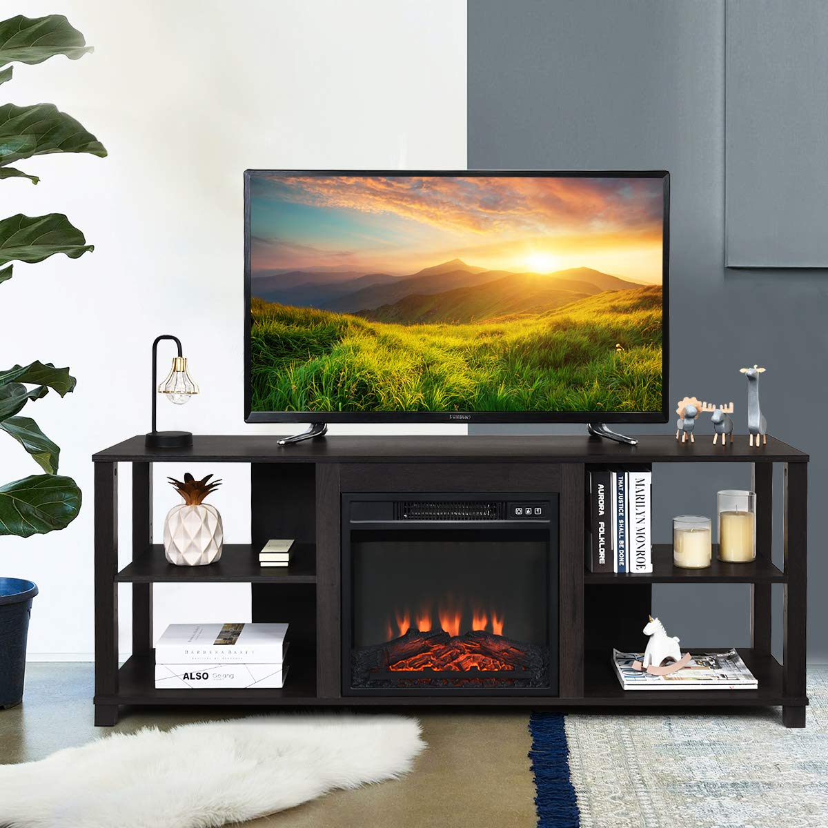 Our TV stand will make your living room tidy and elegant. Made of premium MDF and PB materials, our TV stand has a good load-bearing capacity which is up to 200lbs and it is suitable for 65 inch TV. This furniture stand has four shelves for storing audio video component equipment. Two of the shelves can be adjusted to 5 different positions to store your stuff at different heights. Large storage space is provided for storing bulky items or your electric fireplace. The wooden color makes the TV stand an ideal ornamentation to match your home. Just enjoy an enjoyable relaxing time with your family with our TV stand.