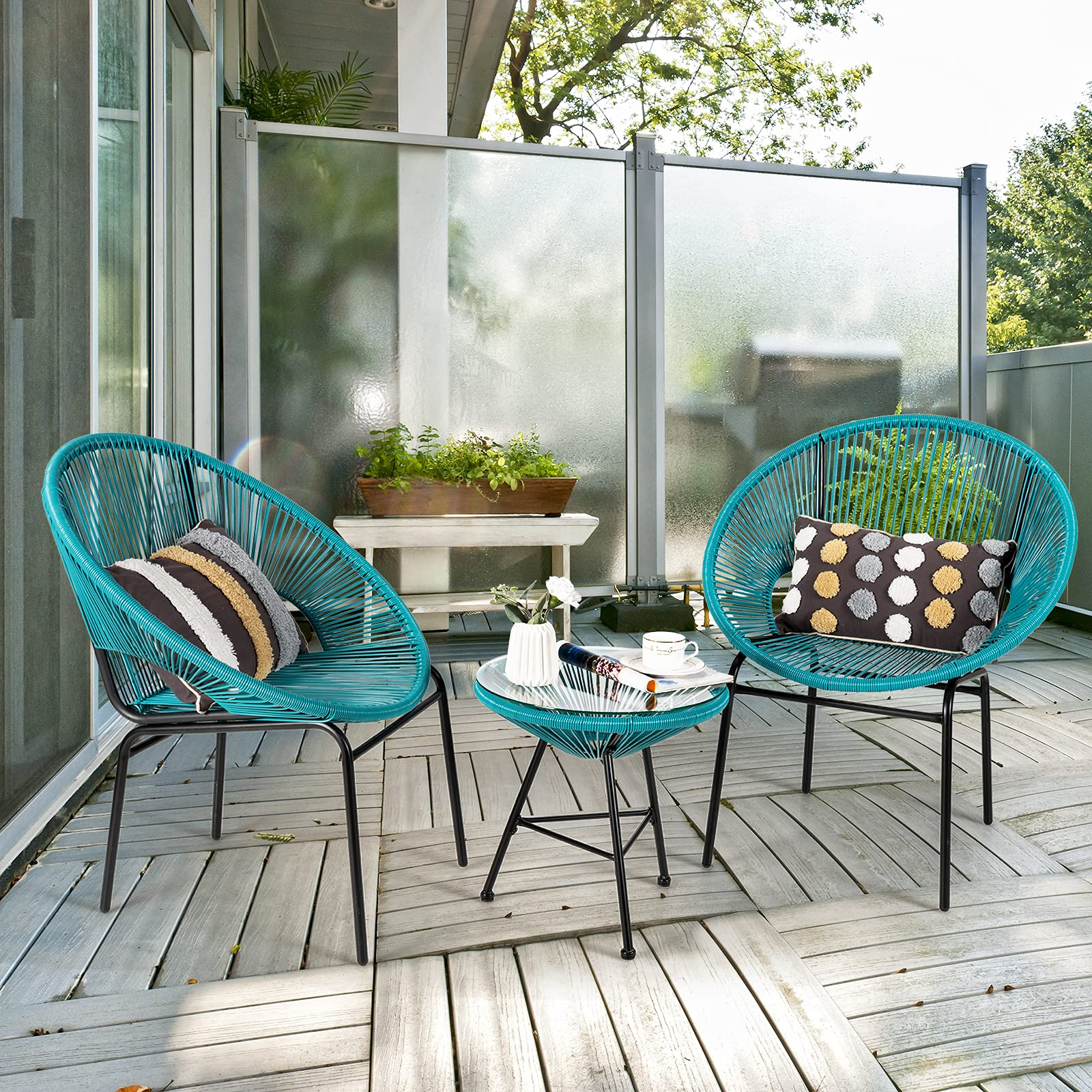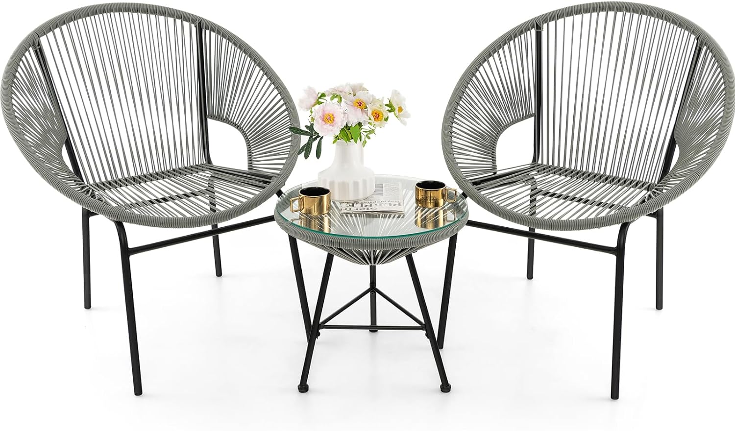 The 3-piece outdoor patio set allows you to enjoy leisure time with your best friends or your loved ones. With a modern and stylish appearance, it's ideal for being used in the patio, backyard, garden, or other outdoor places. The table is constructed with a sturdy steel pipe which is durable while the chairs are made of plastic rope with an ergonomic design to be comfortable when sitting, especially the streamlined backrest that fits your body perfectly and makes you feel relaxed. Besides, the round table has a tempered glass top, which is smooth and easy to clean. If you are looking for such a wonderful outdoor furniture set, don't hesitate to purchase it now!