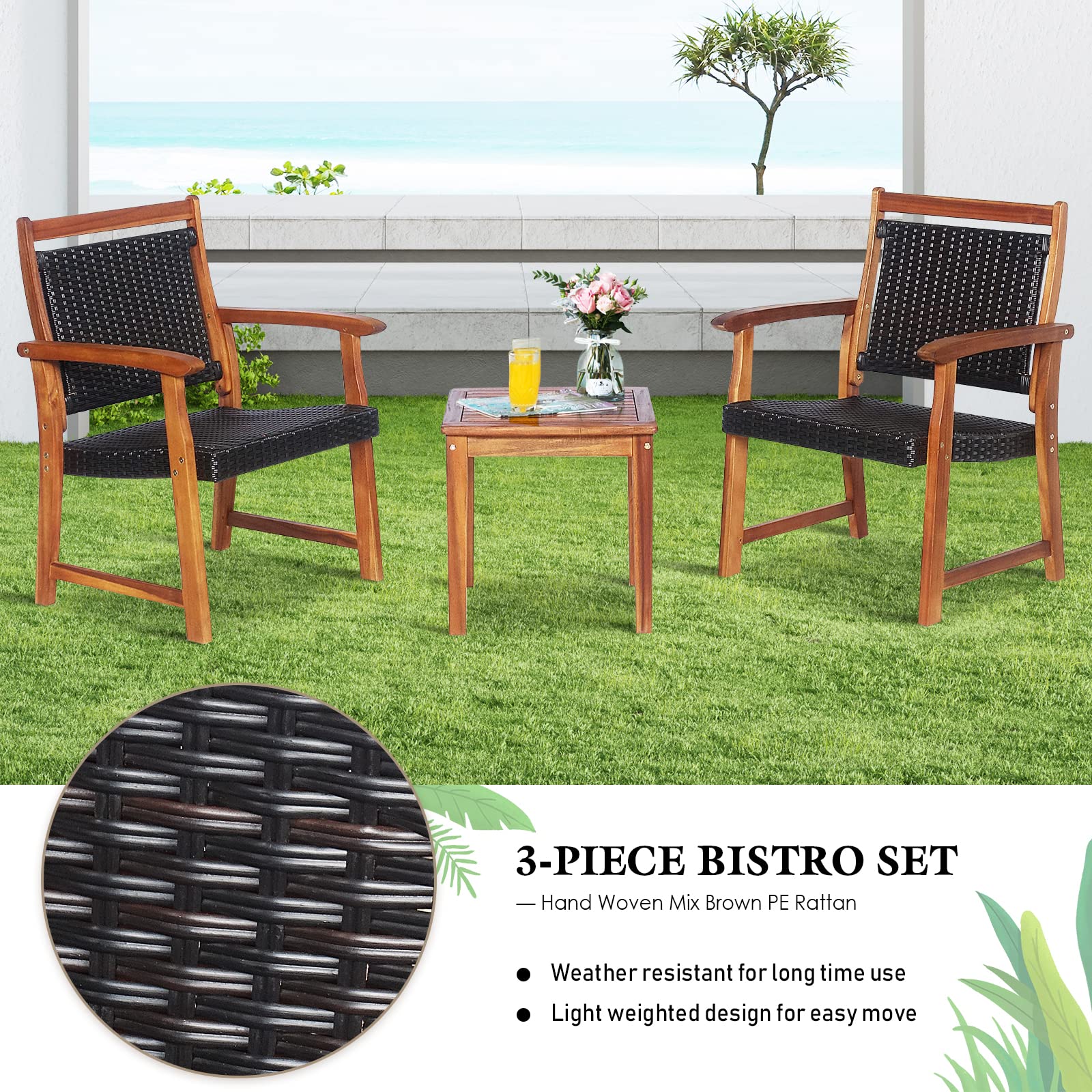 Want to change the view in your outdoor setting? Add our patio bistro set to your list. Combining natural wood elements with PE wicker, this patio conversation set intrigues a pastoral appeal, suitable for poolside, garden, park, and more. Solid hardwood material forms a strong structure for chairs and tables while the PE wicker guarantees a breathable seat and backrest. This bistro set creates a leisurely and intimate spot with 2 comfortable seats and a side table. Besides, it is easy to assemble the chair set if you follow the instructions correctly. Elevate the outdoor settings with our 3-pieces outdoor patio furniture set!