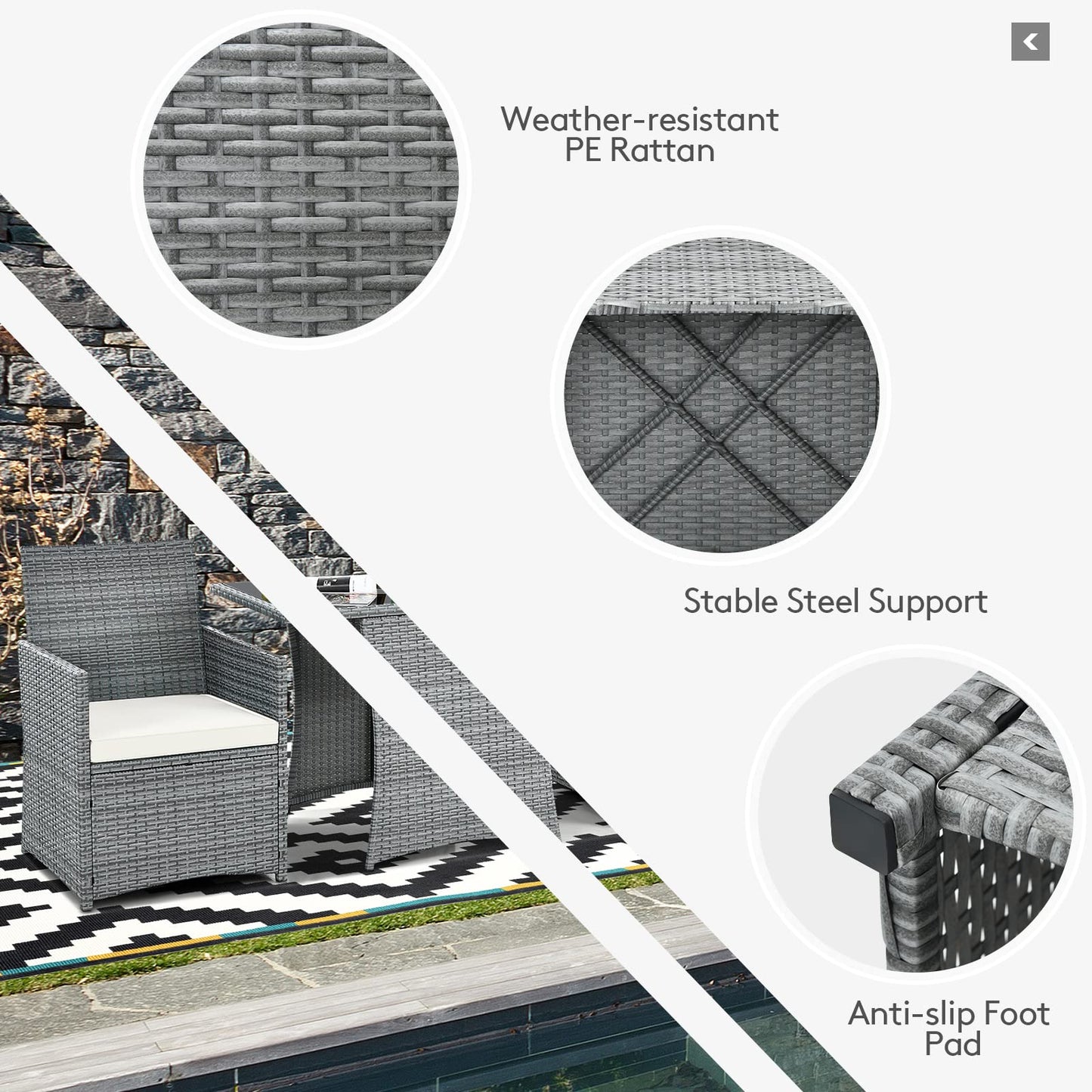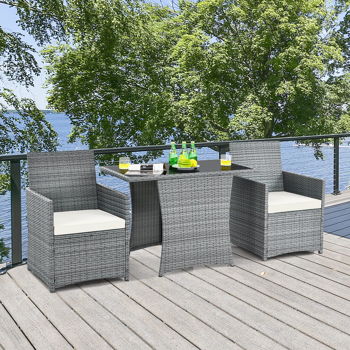 Start your comfortable outdoor living with this 3 pcs patio dining set! With curved backrests, comfy armrests, and soft cushions, this outdoor bistro set provides optimal comfort for outdoor relaxation. If you accidentally spill a drink on the table or cushions, don't worry. The smooth tabletop with durable tempered glass is easy to clean. And the cushion covers with zipper design can be detachable for easy maintenance. After using it, you can store 2 chairs under the table to save your outdoor space.