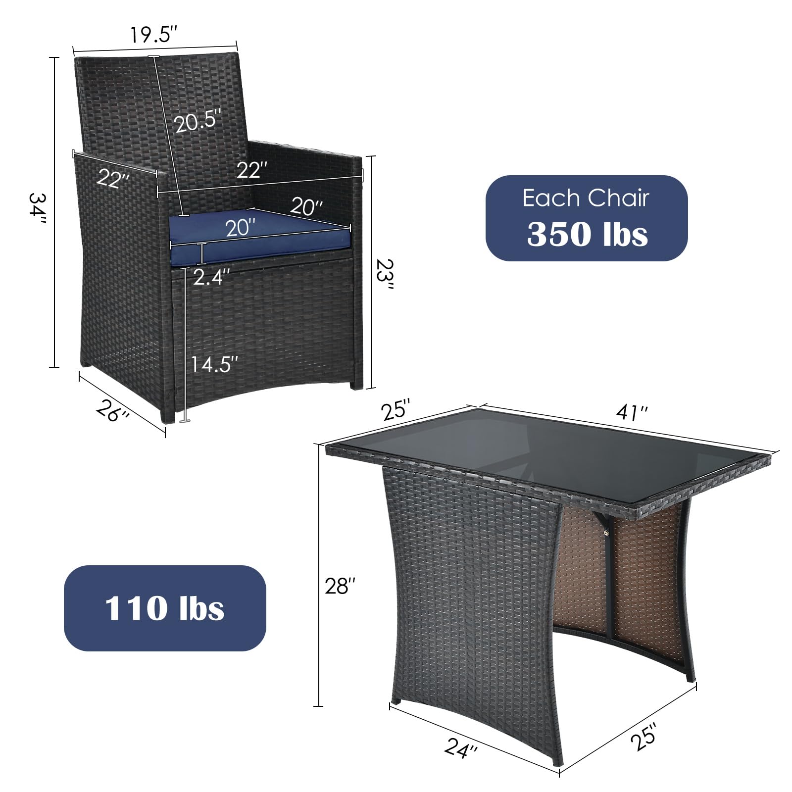 - Selected Materials: Made of rustproof steel frame wrapped with weather-resistant PE rattan, this patio bistro set allows you to leave it outside. Meanwhile, tempered glass is studier and safer than other common glasses. And, both tables and chairs have non-slip foot pads for additional stability.