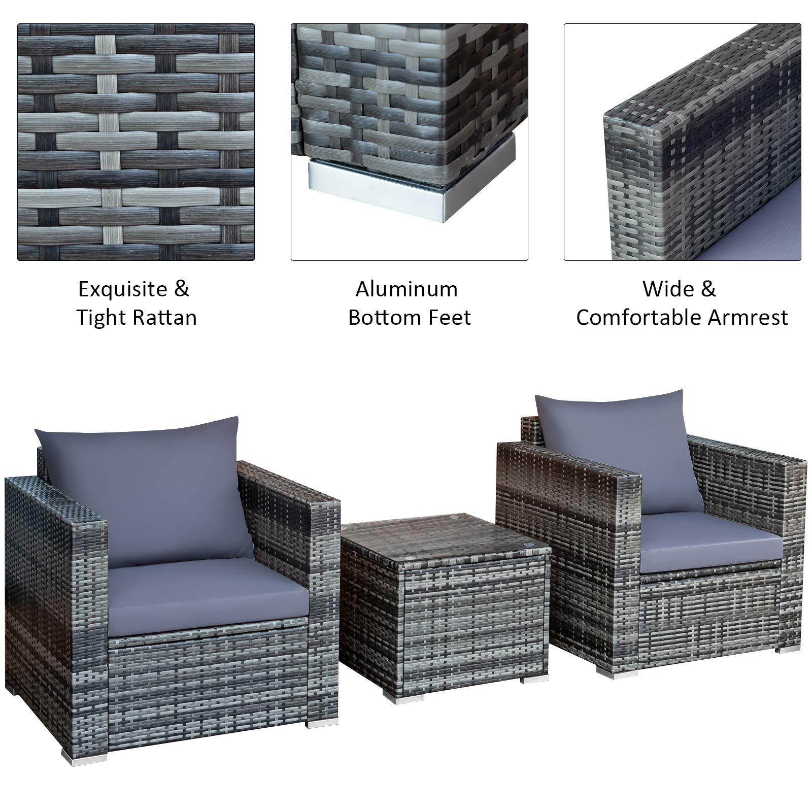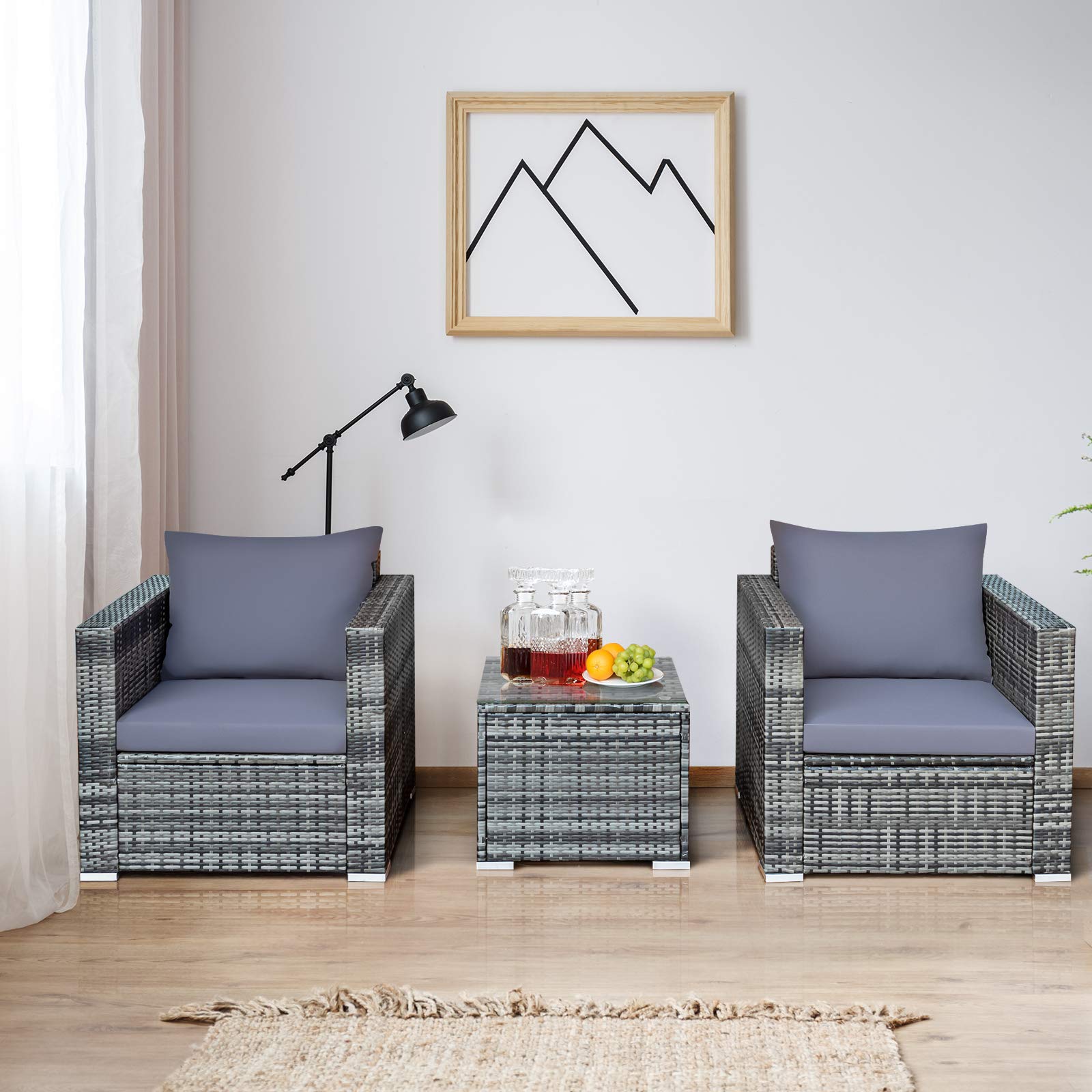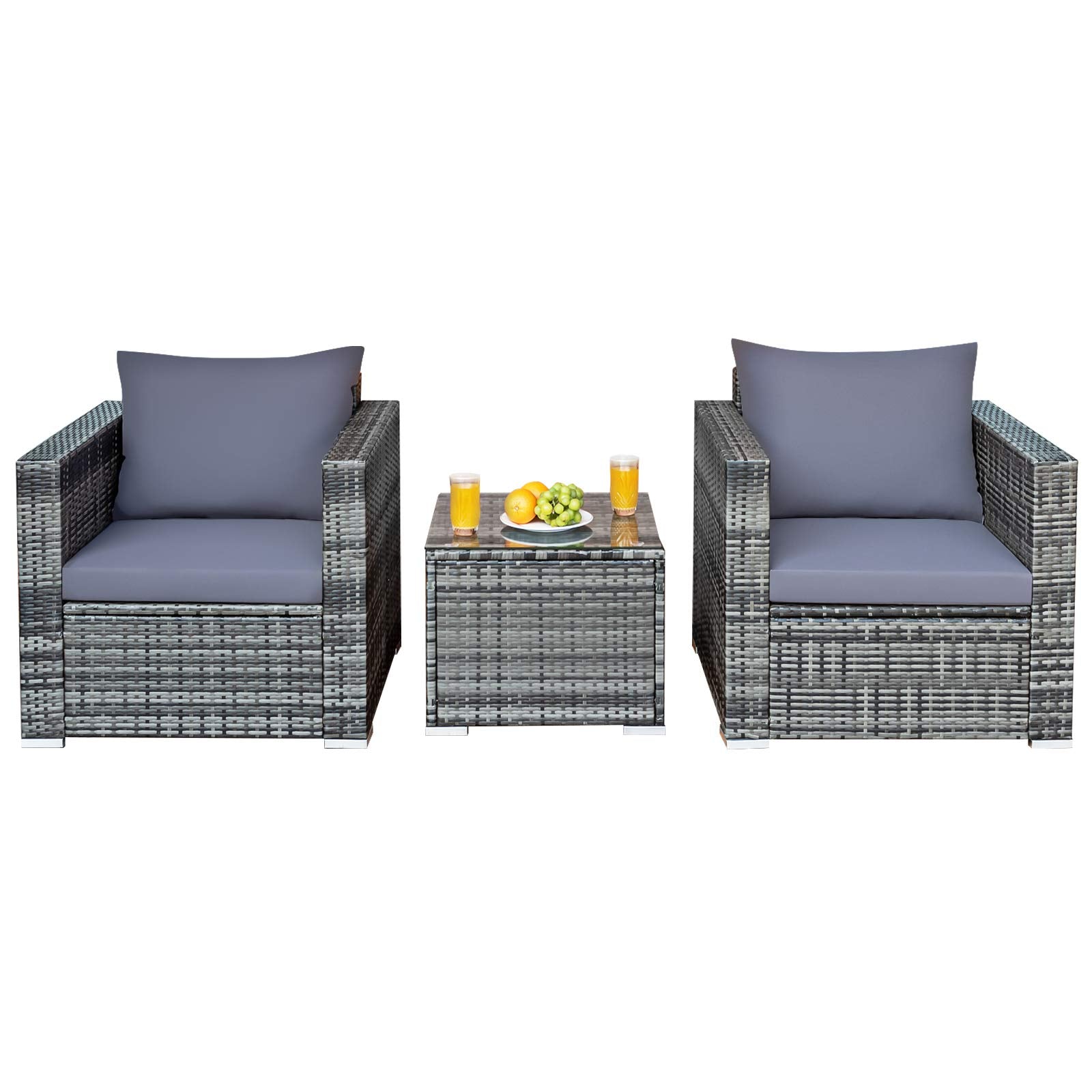 3 Pieces Patio Furniture Set, PE Rattan Wicker Sofa Set w/Washable Cushion and Tempered Glass Tabletop