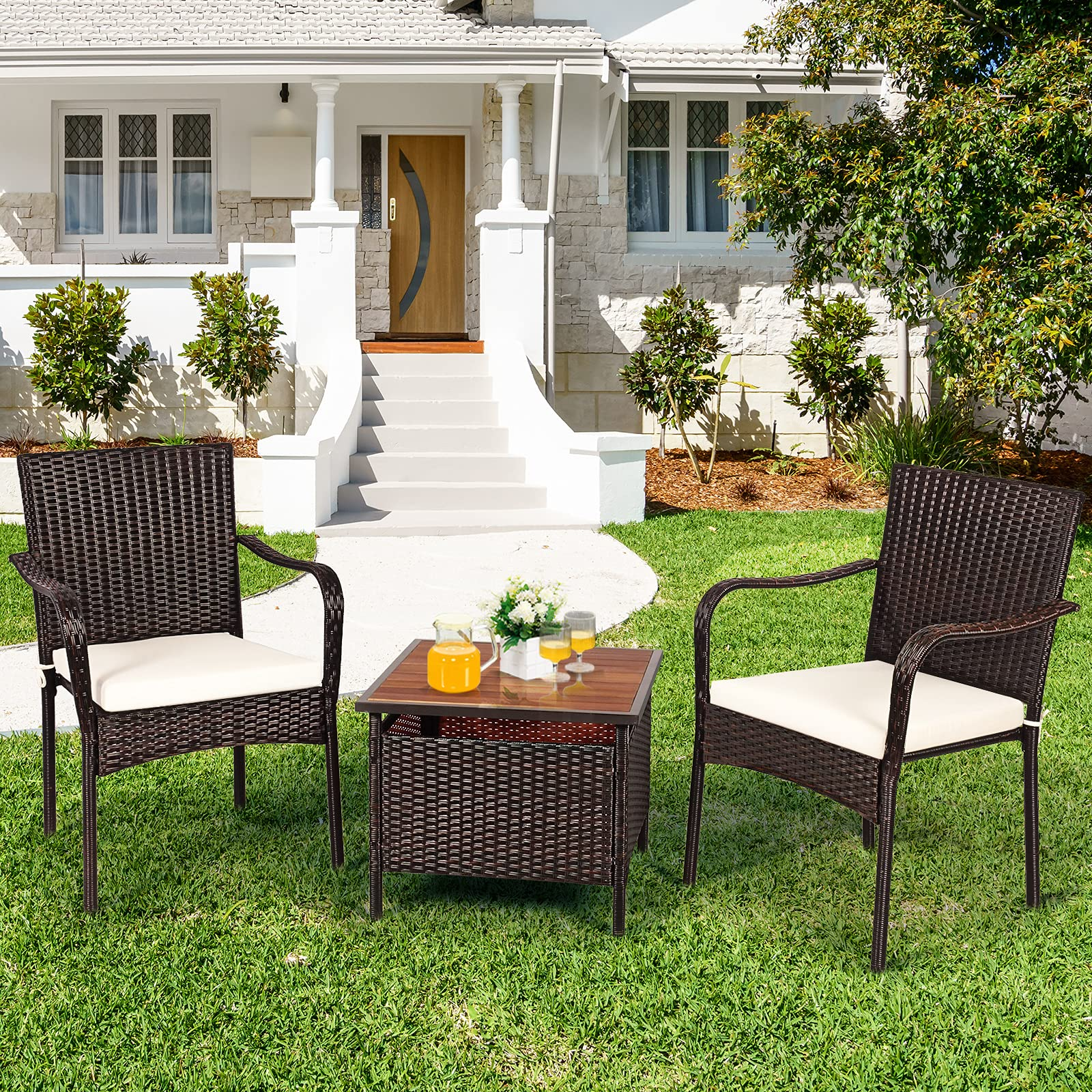 This 3-piece wicker bistro set makes outdoor life more comfortable! With 2 ergonomic chairs with waterproof cushions and 1 large coffee table, this outdoor rattan patio furniture set offers a comfortable place for you to rest. At the same time, you can insert the umbrella (not included) into the 2"umbrella hole, avoiding direct sunlight. To save your outdoor space, these 2 chairs can be stacked after using them. Furthermore, weather-resistant PE rattan and durable acacia wood make this conversation set fit for outdoor use, such as poolside, backyard and garden, etc. Meanwhile, the heavy-duty steel frame with an anti-rust surface holds up to 350 lbs for each chair and 180 lbs for the coffee table.