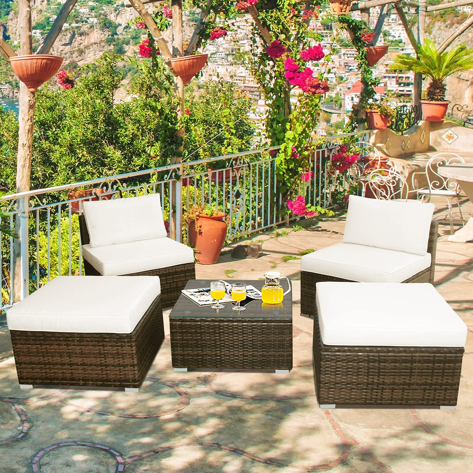 Enjoy yourself with this gorgeous 5-piece furniture set. The stylish design of the set is perfect for any outdoor space including yards, patios, gardens, porches, or indoors if you want. The frame of the set is crafted with heavy-duty steel and wrapped with sturdy and hand-woven PE rattan. And the set will provide a large weight capacity and can be used for a long time. Plus, the cushions are made of soft polyester fabric and the cover also can be detached with a zipper. It is easy to clean the cover. And the furniture set is flexible when you have different events, which can be used as seating or a chaise lounge. This is a sofa set that can bring a comfortable and relaxing experience to you.