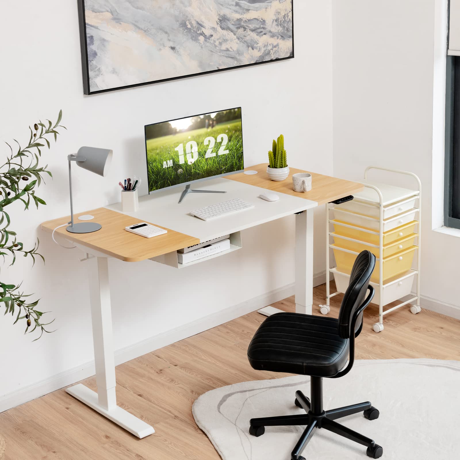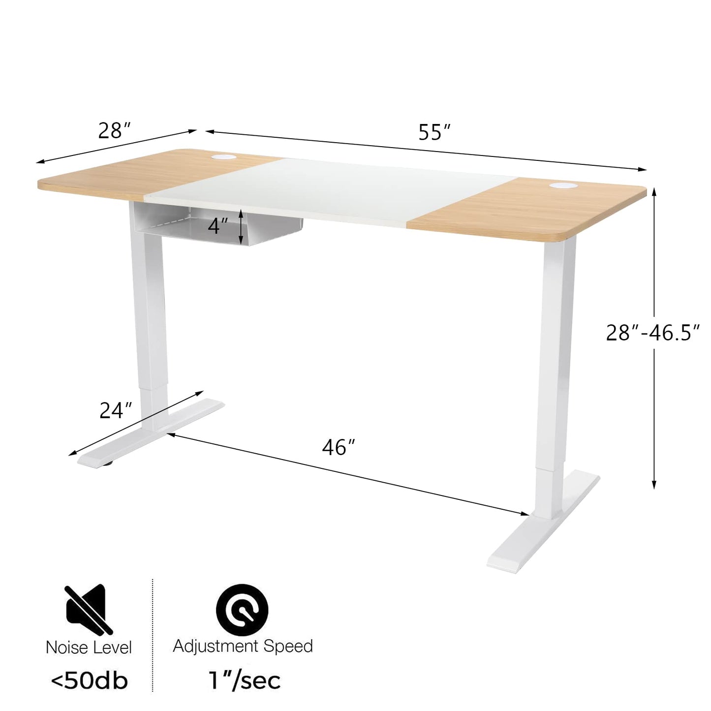 The sit-stand desk has a smart control panel at the edge which tells you the current height and allows you to control the desk. With this control panel, you can preset two memory positions and adjust the overall height from 28" to 46.5" at the speed of 1"/sec (below 55 dB). Both functions allow you to quickly transition from sitting to standing mode, which is definitely good for your health. The control panel can also lock and unlock the motorized table. 55"x 28" desktop with 2 cable holes is spacious enough to accommodate two computers while keeping wires organized. Plus, it has an anti-collision device further guaranteeing user safety. The open compartment, headphone hook, and cable management tray keep different items in perfect storage space. It is worth mentioning that the sit-stand desk is equipped with a USB port for charging electric devices.