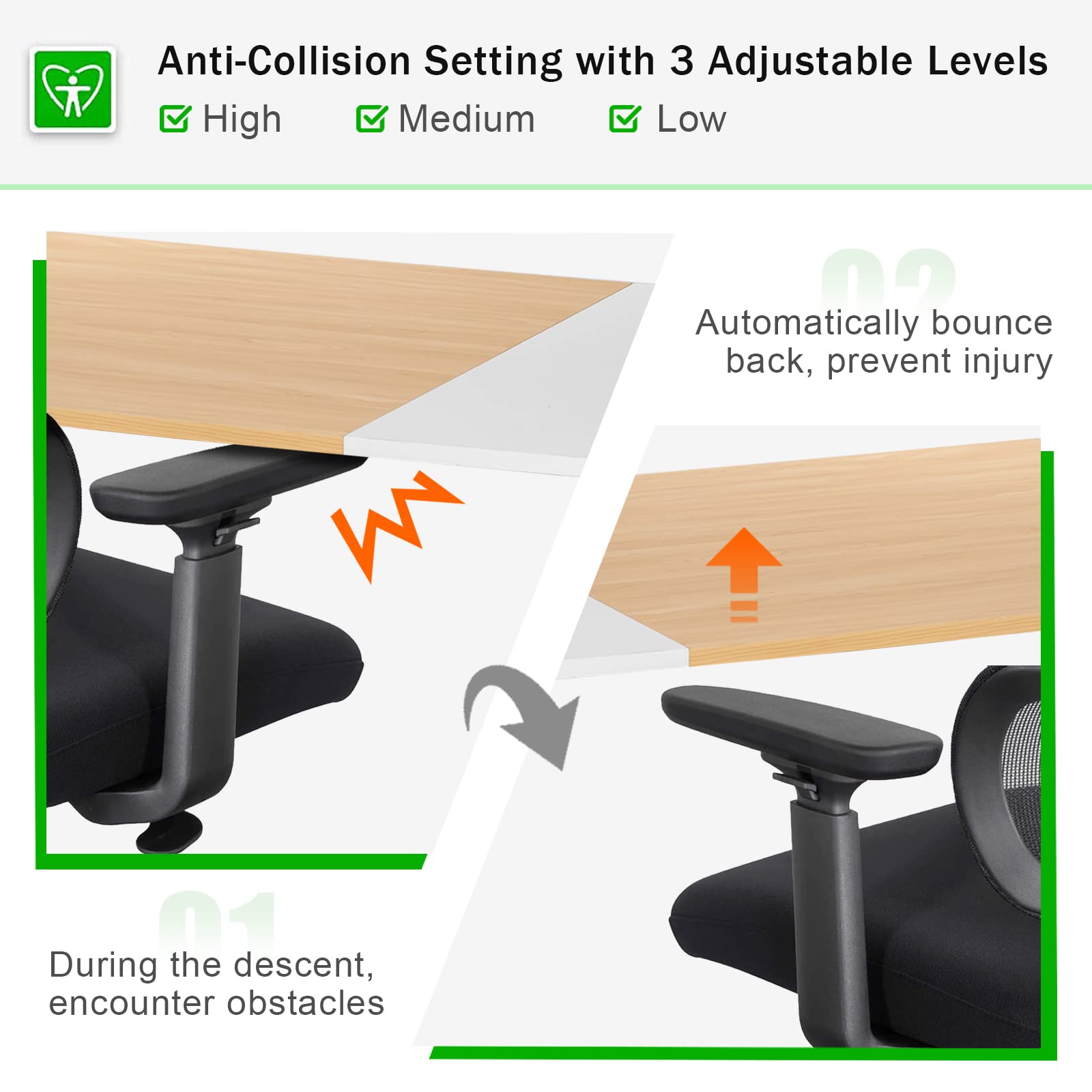 Anti-collision technology with 3 adjustable levels prevents injuries