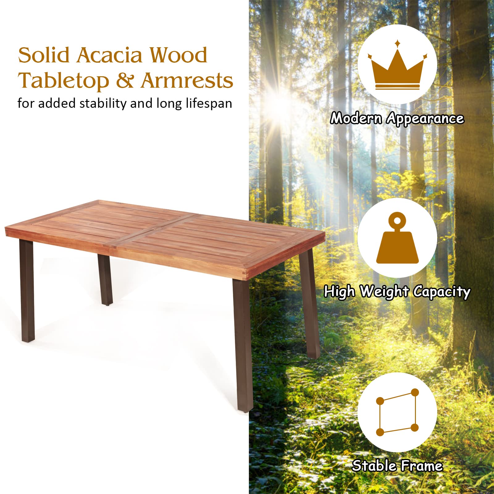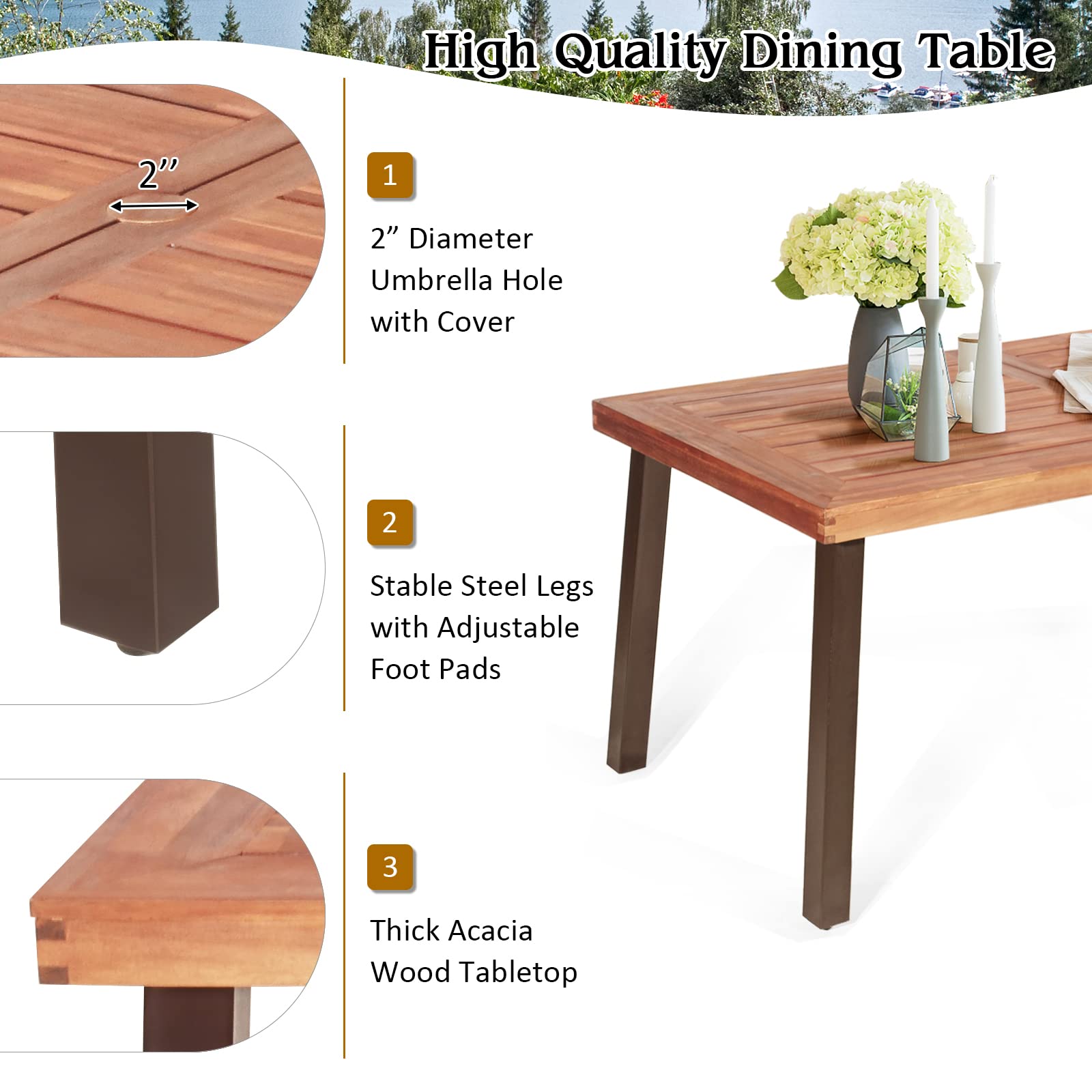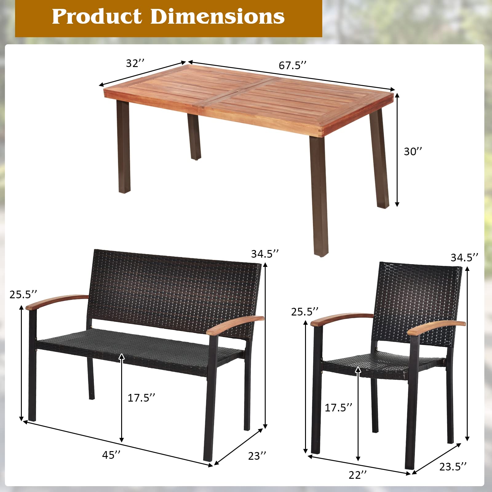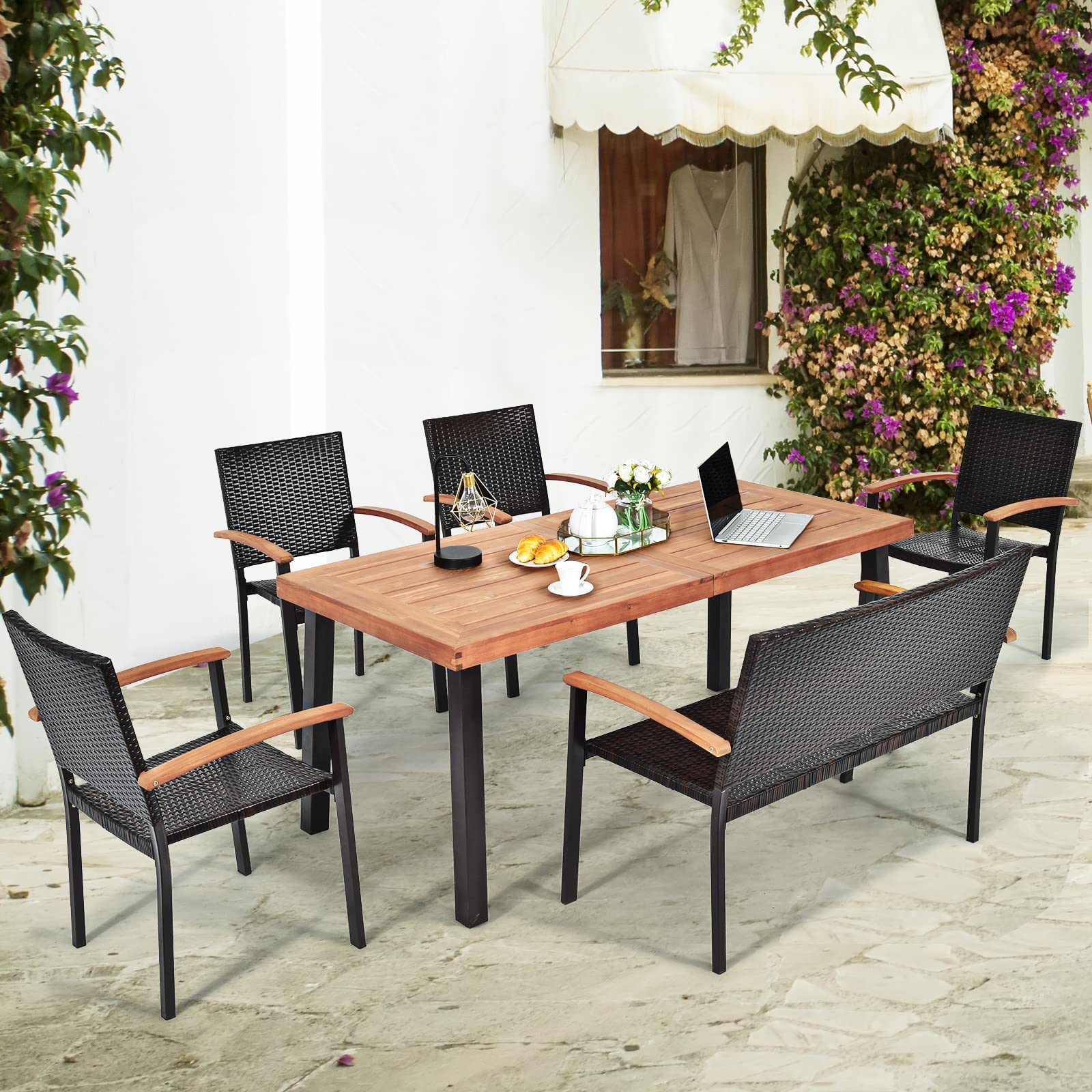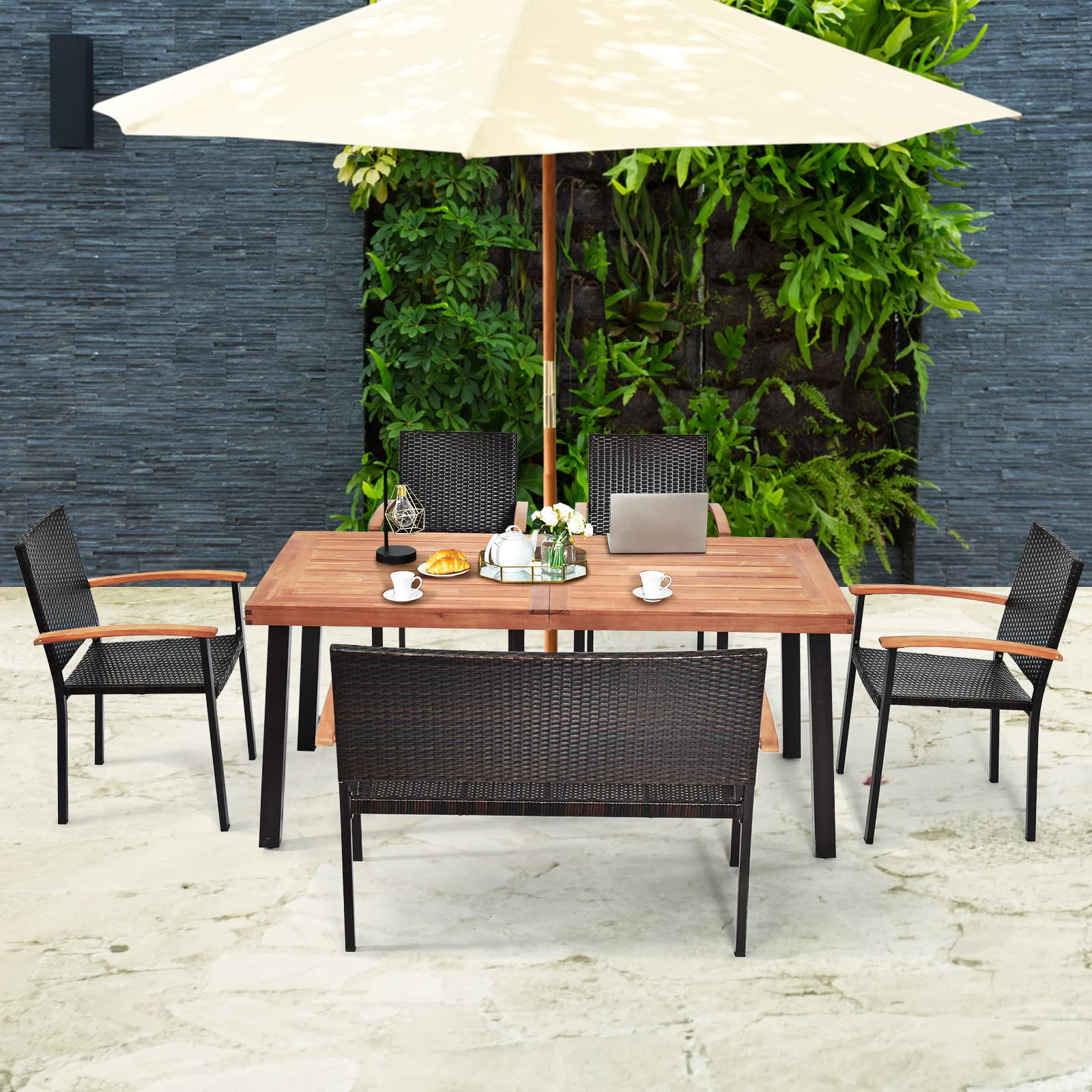 This elegant and natural dining set goes well with any outdoor living area, including the garden, backyard, poolside, patio, and more. Coming with 1 large table,4 rattan chairs, and 1 rattan bench, this dining set can offer a cozy place for you to hold a party or have meals with your family members or friends. The spacious acacia wood tabletop is big enough for 6 or more people. Besides, there is an umbrella hole on the tabletop for you to place an umbrella to block out the dazzling sunlight in hot weather. Made of a powder-coated steel frame and all-weather PE rattan, this dining set is stable and can be used for a long time. What's more, the chairs and the bench are designed with curved backrests and wide acacia wood armrests to give you upgraded support and comfort.