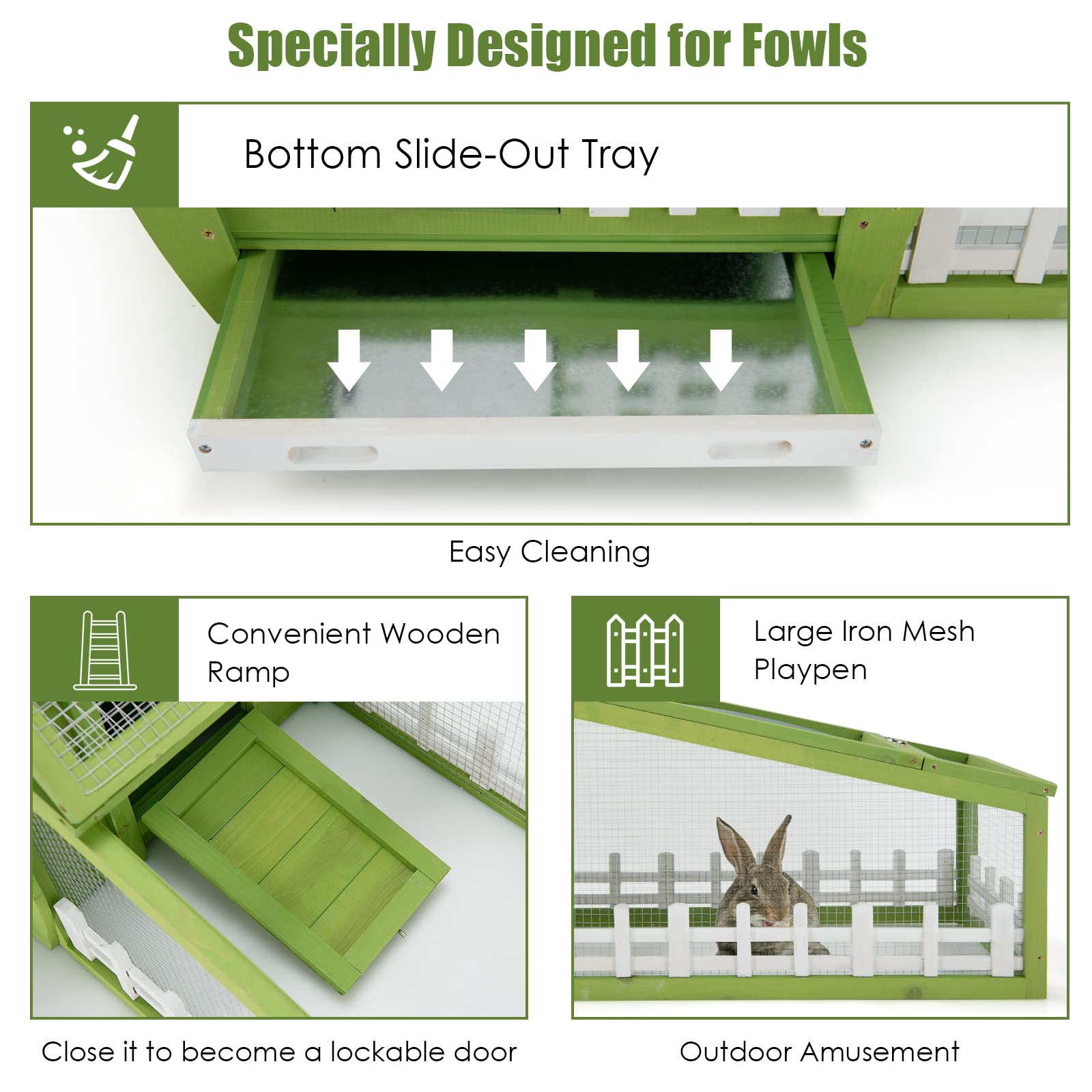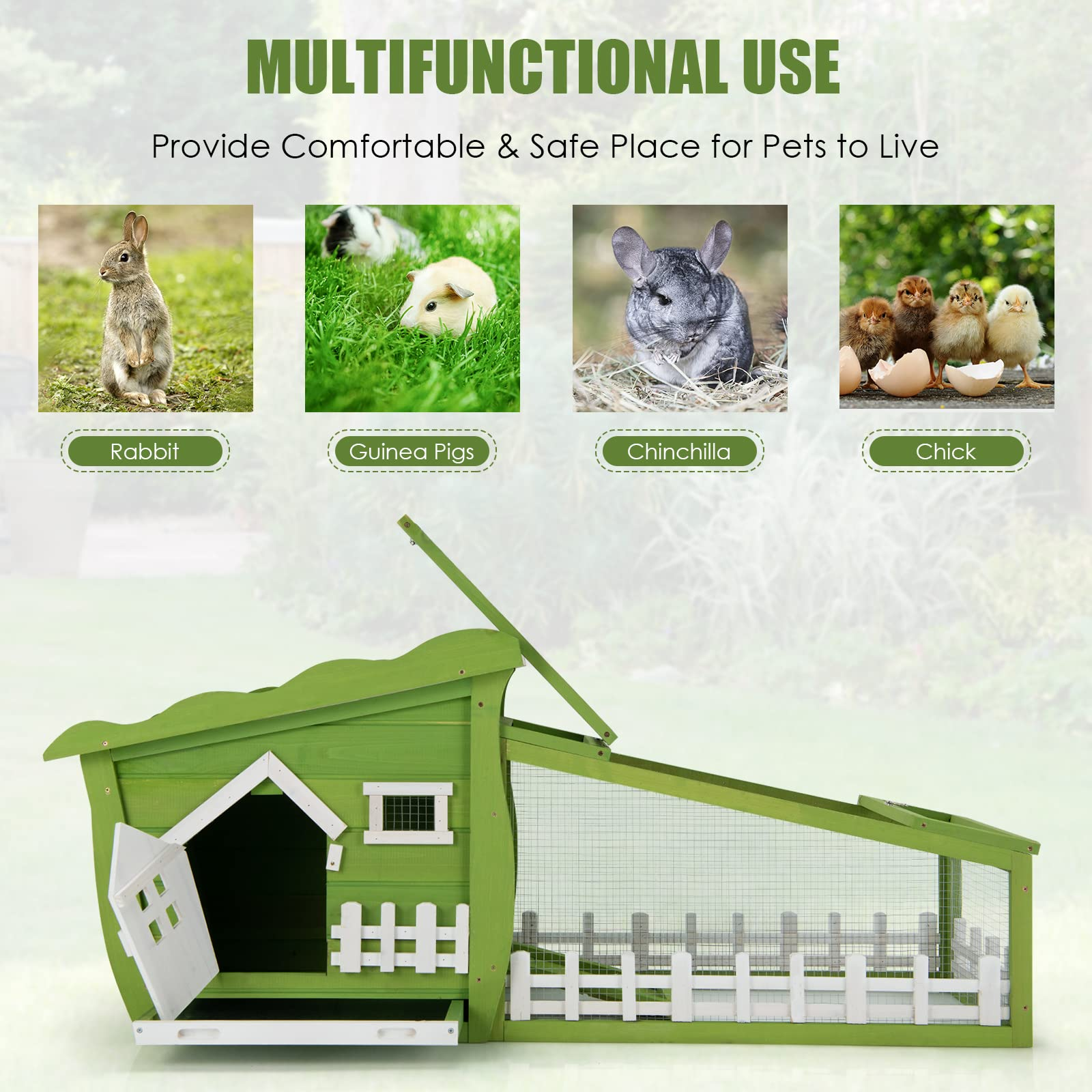 Our rabbit hutch will be your excellent partner and create a cozy safe house for your pets! You may always be troublesome with how to keep your pets in free space as well as not be able to escape. Our rabbit hutch will certainly meet your needs. It provides your pet with a running area and a resting area, both of which are equipped with iron wire to prevent your pets from elements and predators. You can easily interact with your pets by a door and a skylight with slide-bolt latches. Moreover, you don't really need to worry about bad weather comes because weather-resistant material well withstands rigorous conditions and makes it a reliable shelter for your lovely pets. Surely, it provides a comfortable and safe place for pets to live.