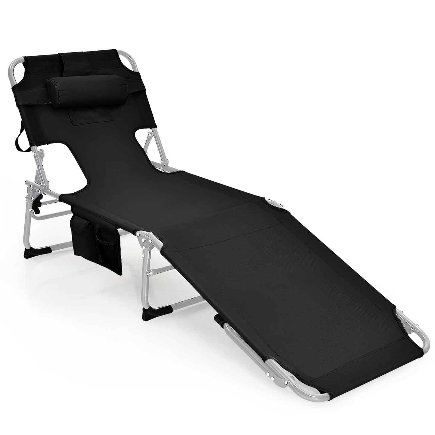 Made of high-quality oxford fabric, our bench lounge chair is sturdy enough to stand the test of time. Besides, the premium steel and aluminum frame is resistant to high temperatures and rust, so you can use this beach chair both indoors and outdoors. With a high load-bearing capacity of up to 330 lbs, you can use this chair without worrying about deformation. In addition, the breathable fabric and ergonomic pillow offer a soft and comfortable sitting experience. The face cavity with 2 arm slots allows you to watch a cell phone or read a book as you like. Additionally, the installation-free design greatly saves you time and energy. 5 adjustable positions meet your different needs, just enjoy your leisure time with this multifunctional beach chair!