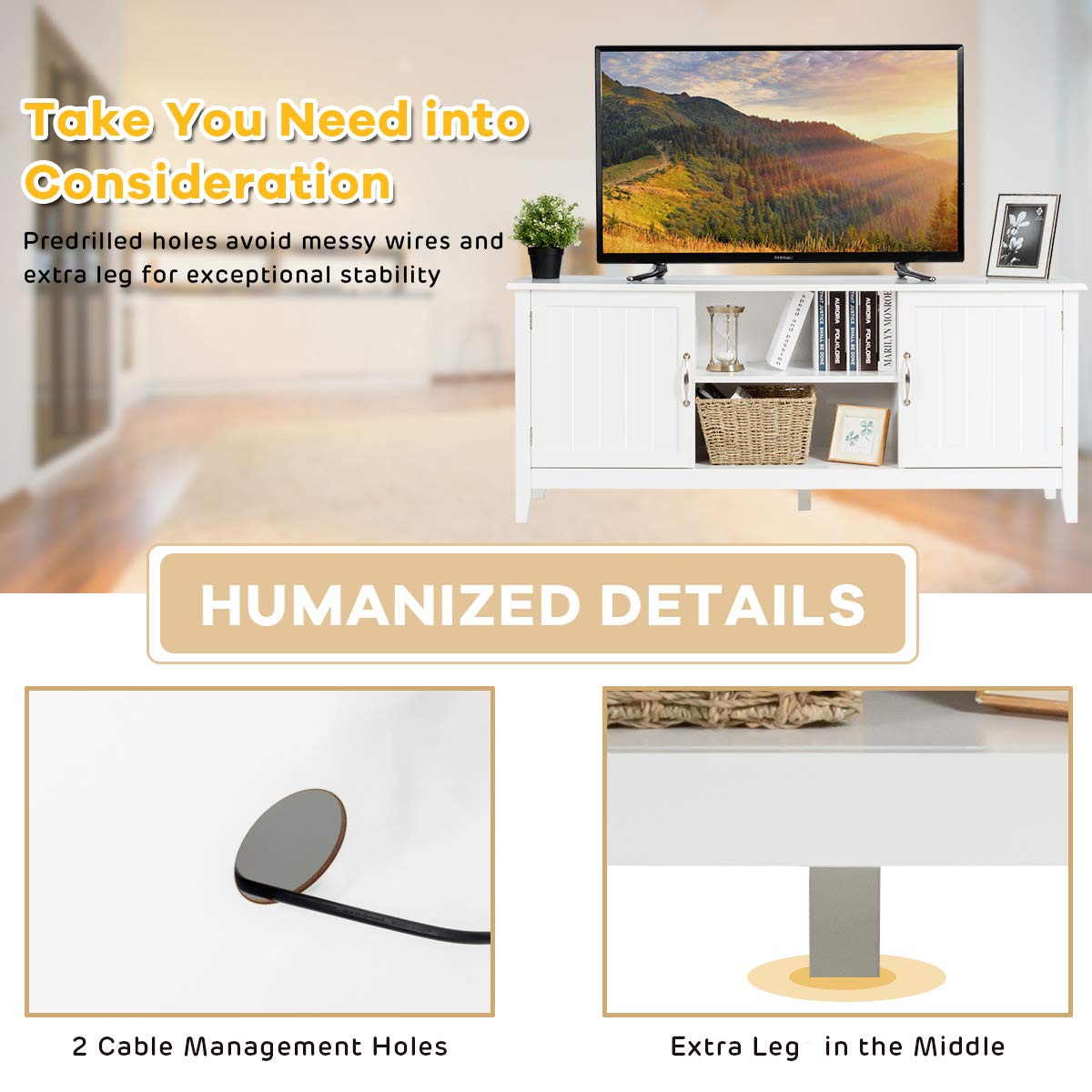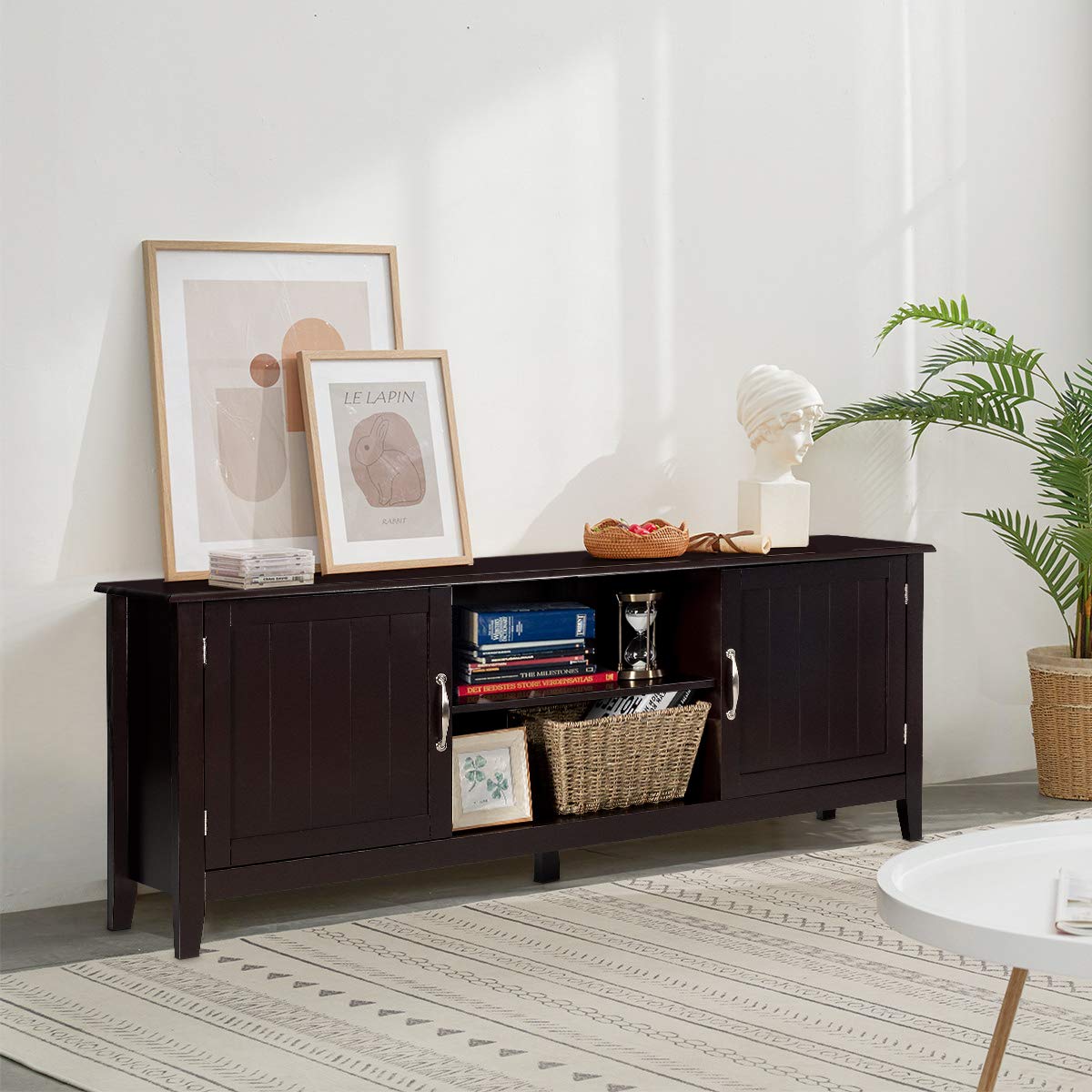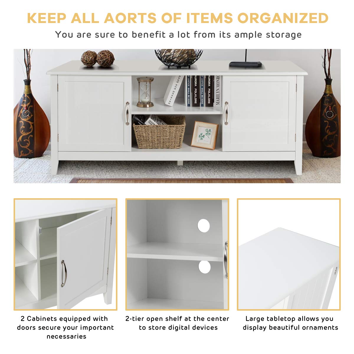 Watch TV without any disturbance caused by messy wires or sundries. The tall TV stand featured ample storage will help you. There are 2 open shelves with 2 cable management holes, designed to place media devices while keeping wires organized. Some media items like game gear, movie collection, and remote control can be stored in large cabinets. Additionally, the enclosed cabinets with doors leave you no worry about the entering of dust. Furthermore, a wide tabletop can accommodate TVs up to 65 inches. It is sure to be a perfect TV cabinet when you put the TV on it and also an aesthetic complement if you mount the TV on the wall. Also, a stable structure with 5 thickened legs lets you use it with great confidence. Bring the simple elegant TV stand home and let it create a more beautiful home style.?
