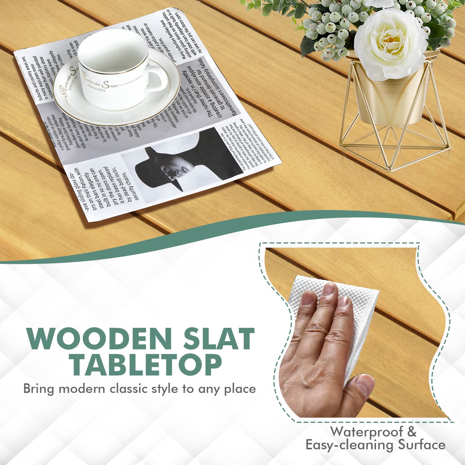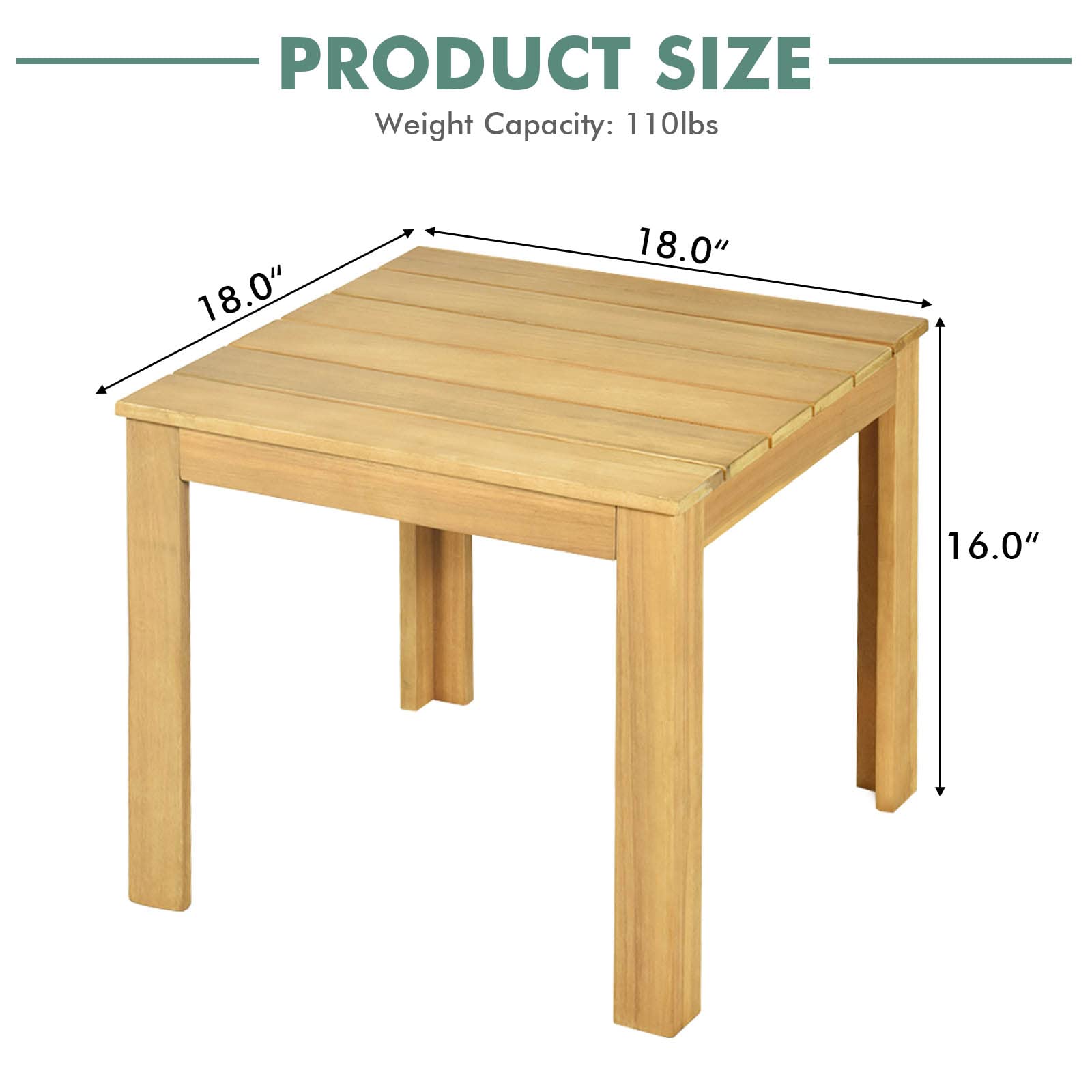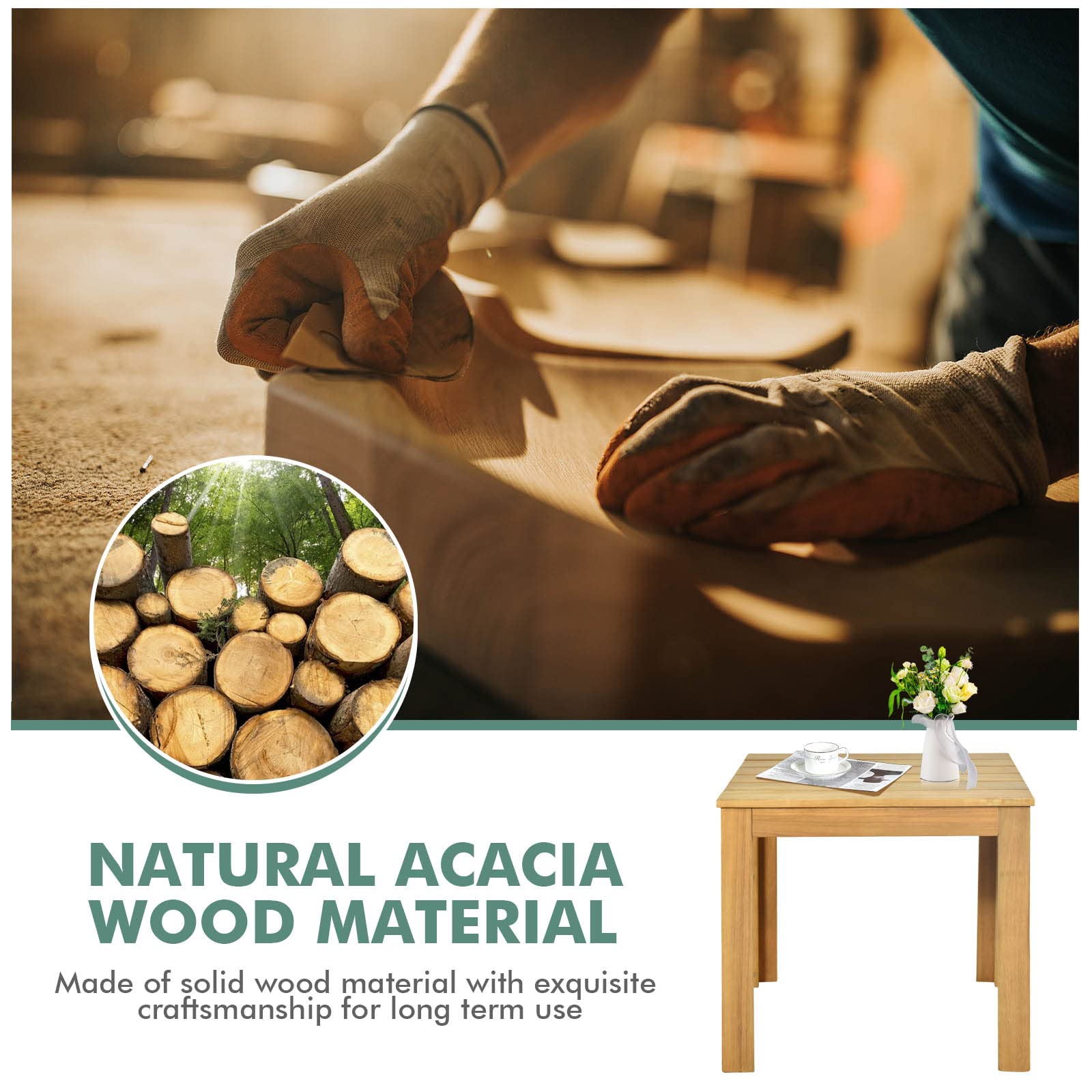 This outdoor side table is perfect to complement your indoor or outdoor space. It is sturdy because of its high-quality acacia wood. The whole frame is connected with premium accessories which add stability and weight capacity. With varnish on the surface, the side table is waterproof and scratch-resistant. It is suitable to place beside your outdoor sofa or chair in the backyard, patio, garden, poolside, dining room, and living room. When guests come to your home, the side table can be used as a good chat table for you to have a pleasant time together.