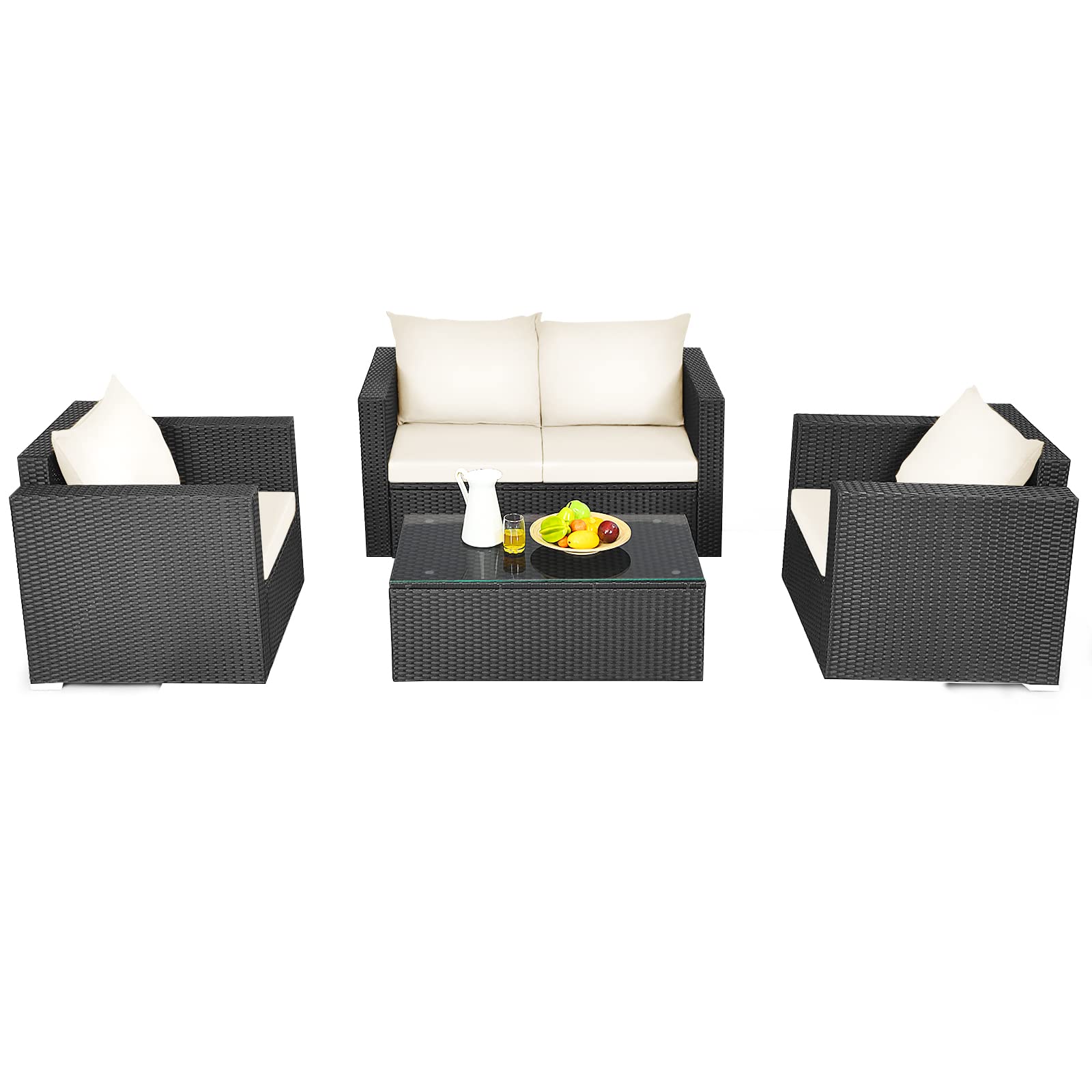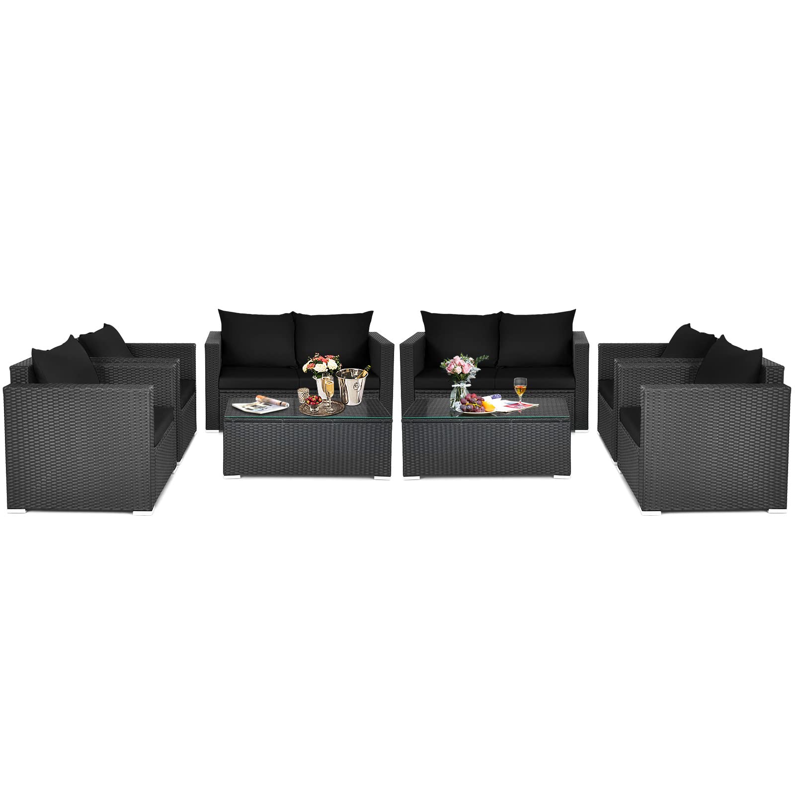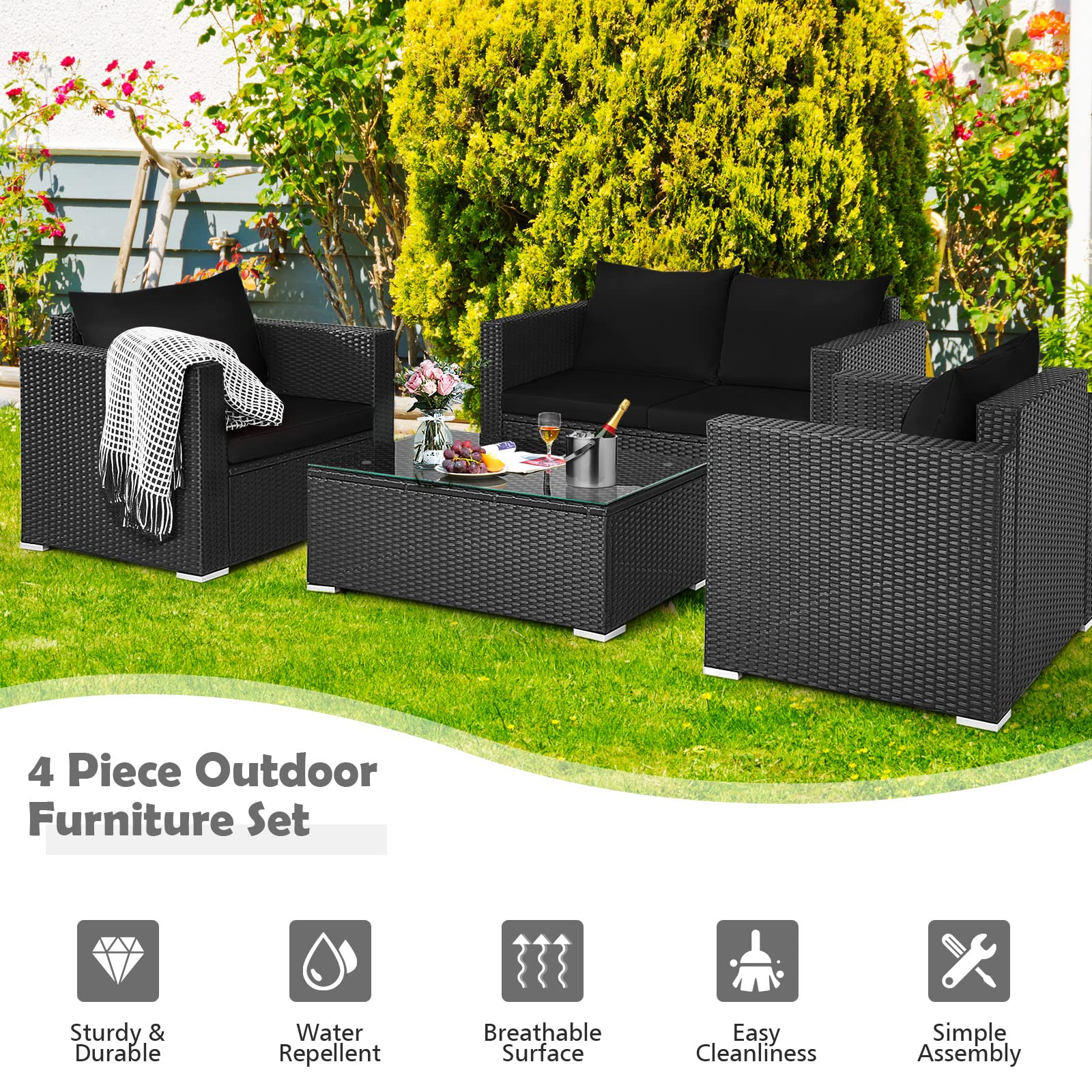Are you waiting for a proper rattan sofa set to spend your leisure time on your patio or poolside? Our outdoor sofa set with a contemporary style can well satisfy your demand. Because of the soft seat and back cushions, this outdoor sofa set can provide you with a comfortable sitting experience. Widened armrests relax your arms and provide better support for your body. The frame is made of powder-coated steel and durable PE rattan wicker, which is sturdy enough to ensure a long lifespan. Aluminum foot pads at the bottom enhance the stability. Besides, the rattan table is equipped with a tempered glass tabletop, which is convenient for you to place some drinks and fruits on it. If the cushion gets dirty, you can simply zip off the cushion cover and wash it.